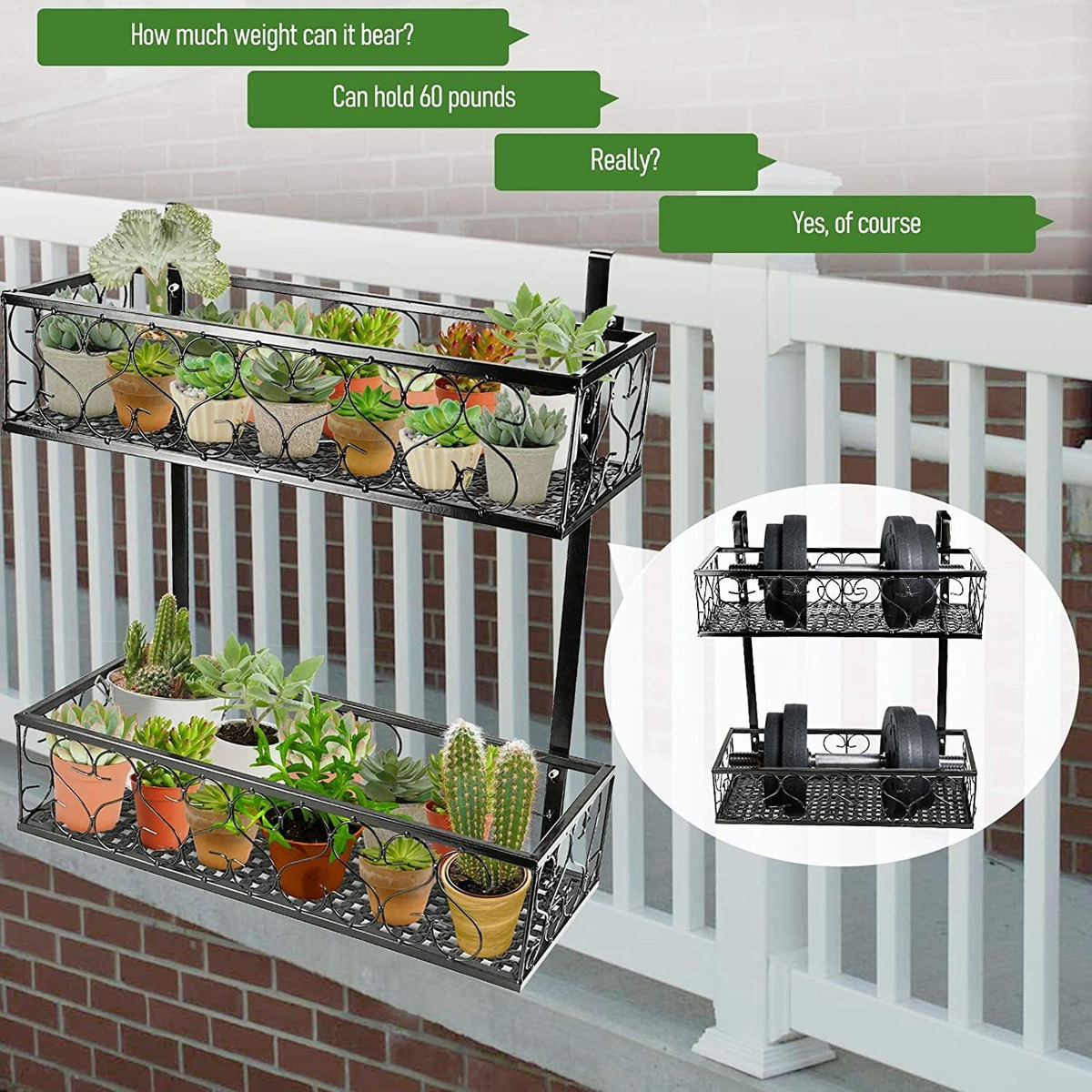 Soporte de hierro para macetas Este soporte para macetas está hecho de material de hierro grueso mediante un proceso de soldadura de alta resistencia, resistente y duradero, larga vida útil, adecuado para uso en exteriores en todo tipo de clima.; Tamaño: 19.7 x 7.9 x 19.7 in, diámetro del gancho: 2.6 in, el soporte para macetas de balcón se puede colgar fácilmente en una barandilla cuyo tamaño no exceda los 2.6 in.; Buena capacidad de carga: la parte inferior de la estructura de la rejilla adopta un diseño mecánico, y los rieles de guía están entrecruzados, lo que mejora la capacidad de carga y la estabilidad del marco general, no es fácil de deformar, y puede mostrar múltiples macetas al mismo tiempo.; Diseño de 2 niveles: nuestro soporte para macetas tiene 2 capas, que es fácil de montar y desmontar. La calidad general después del montaje no es diferente de la soldadura. Puede satisfacer tus necesidades de colocar varias macetas sin preocuparte por tus macetas. Se puede colocar en todas partes.; Soporte decorativo para macetas: el estante de balcón está rodeado de patrones únicos y tiene un aspecto hermoso. Se puede colgar en el balcón, terraza, valla y otras barandillas, añadiendo sabor natural a tu espacio vital. El soporte para macetas de balcón de 2 niveles puede mostrar tus macetas en múltiples espacios, y es fácil de colgar en las barandillas como balcones, terrazas, cubiertas, etc., añadiendo un efecto decorativo perfecto a tu espacio vital.