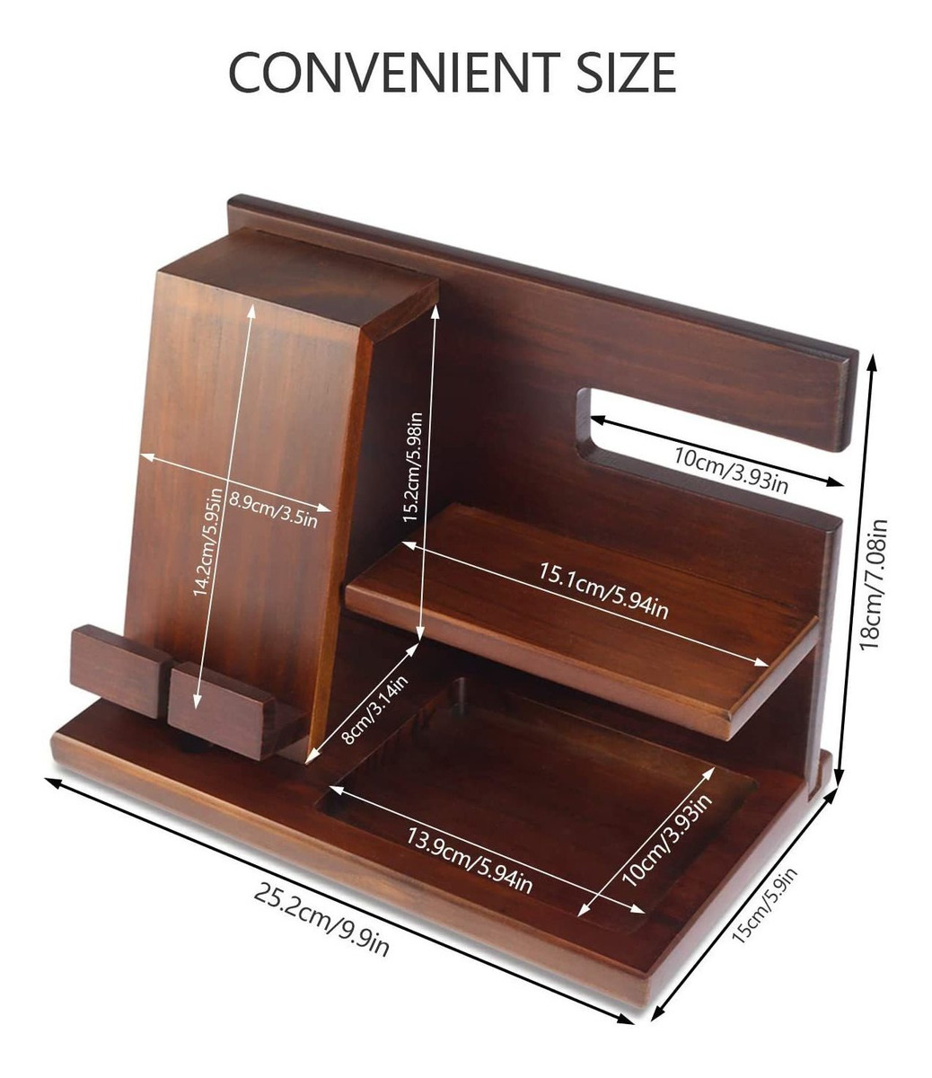 Diseño único: la estación de acoplamiento para teléfono tiene una gran capacidad para colgar llaves, colocar carteras, colgar relojes. Nota: los accesorios que se muestran en las fotos no están incluidos; Natural y respetuoso con el medio ambiente Esta estación de acoplamiento personalizada para teléfono utiliza madera maciza con pulido suave y acabado protector que se convertirá en un accesorio llamativo y muy práctico en tu escritorio o mesita de noche.; Fácil de montar: se instala de acuerdo con las instrucciones (idioma español no garantizado). Es simple y conveniente. Sólo unos pasos, obtendrás la bonita estación de acoplamiento para teléfono.; Mejor organizador de almacenamiento Compatible con todas las marcas de smartphones, tabletas, auriculares inalámbricos y tu reloj (no es compatible con otras marcas de relojes inteligentes). El soporte también tiene compartimentos para carteras, gafas, relojes, pulseras de fitness, llaves, artículos de papelería, etc.; El mejor regalo para tu marido, padre, novio, hermano, amigos. Una gran idea de regalo para Navidad, Pascua, Halloween, cumpleaños, día del padre, aniversario, graduación. Todos nuestros productos estan en inglés SKU 91221081333