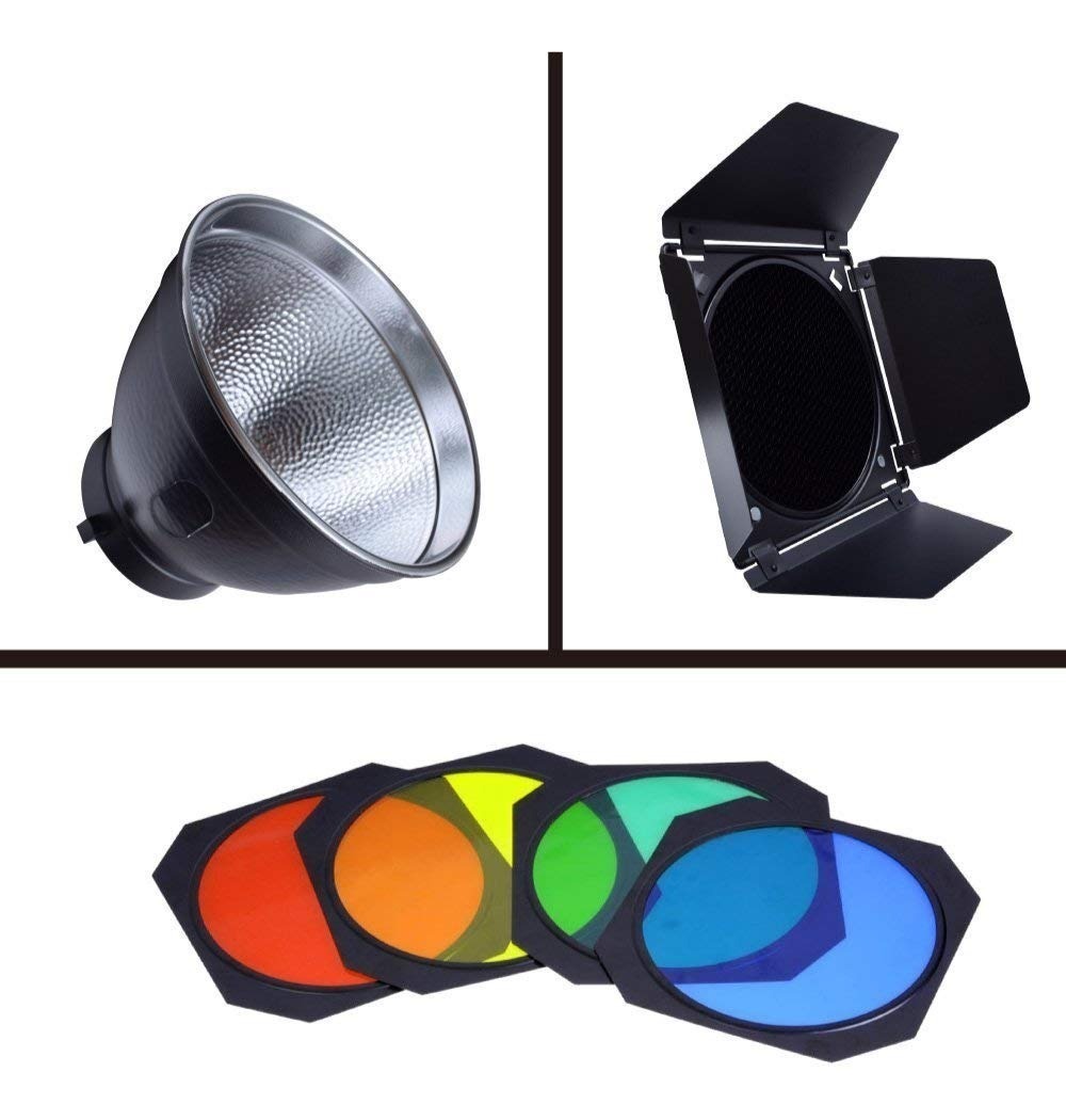 Esta puerta de granero está fijado en el reflector estándar. Las banderas 4pcs es ajustable para la conformación de iluminación flexible. La luz puede ser concentrado por necesidad. También está equipado con filtros 4pcs. Tome ventaja de los filtros para rodar en un entorno diferente .; 4 filtros de color para permitirle tener diferentes colores de fondo. Se utilizan para corregir el balance de luz o crear efectos de iluminación espectaculares .; 1 Honeycomb diseñadas para darle el máximo control sobre la dirección de su luz. La rejilla de panal de abeja a su vez, una cabeza de luz estroboscópica en una fuente de luz especular. Se emitirá un haz de luz con precisión dónde apuntas; Este conjunto barndoor de 4 hojas está diseñado específicamente para su uso en el reflector. Barndoors es accesorios esenciales para cualquier sistema de iluminación. Estos dispositivos alteran la forma, la intensidad o el color de la salida de luz de sus cabezas de fulguración .; El uso de un conjunto barndoor dará lugar a un rayo de luz, cuando está unido a la parte delantera del reflector de la fuente de luz. El tamaño del haz de luz será determinada por la apertura de las hojas, y la distancia de la luz desde el sujeto CARACTERISTICAS