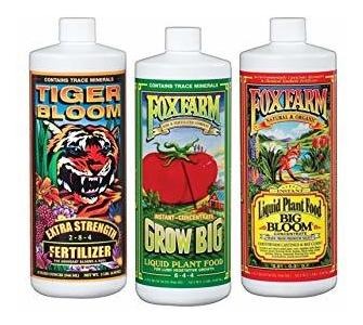 Un paquete de tres fertilizantes líquidos preferidos de FoxFarm; Obtener el jugo adecuado para el uso correcto; Comience con Hydro crecer grande para el crecimiento verde abundante; Cambiar a Tiger Bloom a la primera señal de la yema de establecer o de floración; Utilice la floración grande a lo largo de todos los ciclos de crecimiento para curar sistemas de raíces y aumentar el ciclo de nutrientes; Ideal para maduras, flores y frutos de final de temporada; Crecer grande produce exuberante, vegetativo, crecimiento compacto; Tiger Bloom es una, de acción rápida, fertilizantes ultra-potente de alta fósforo; concentrado de la floración grande Planta de Alimentos es ideal para todas las plantas de floración y fructificación Tamaño: 32 oz
