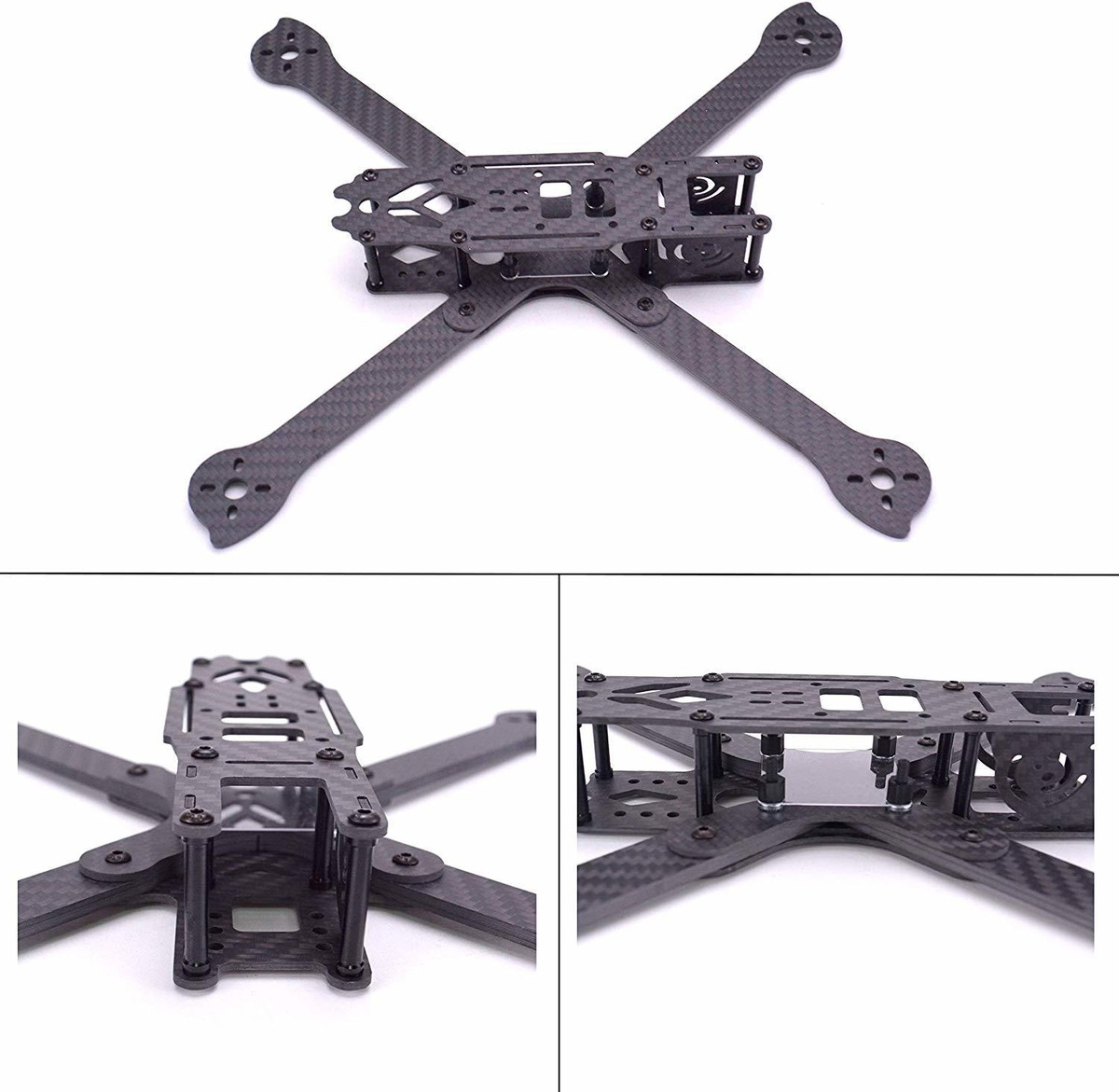cortes limpios lisas con bordes lijados, pura marco de fibra de estilo libre 3K de carbono de alta calidad, super ligeros pero resistentes; Permitir el uso M3x30mm enfrentamiento, compatible con gorpo cardán Tamaño de la cámara; diseño de motor verdadero-X con los brazos extraíbles de 4 mm de espesor; 12.9 níquel clase palted hardware tornillo de alta calidad; Montaje superior de la batería para una óptima CG Especificaciones: