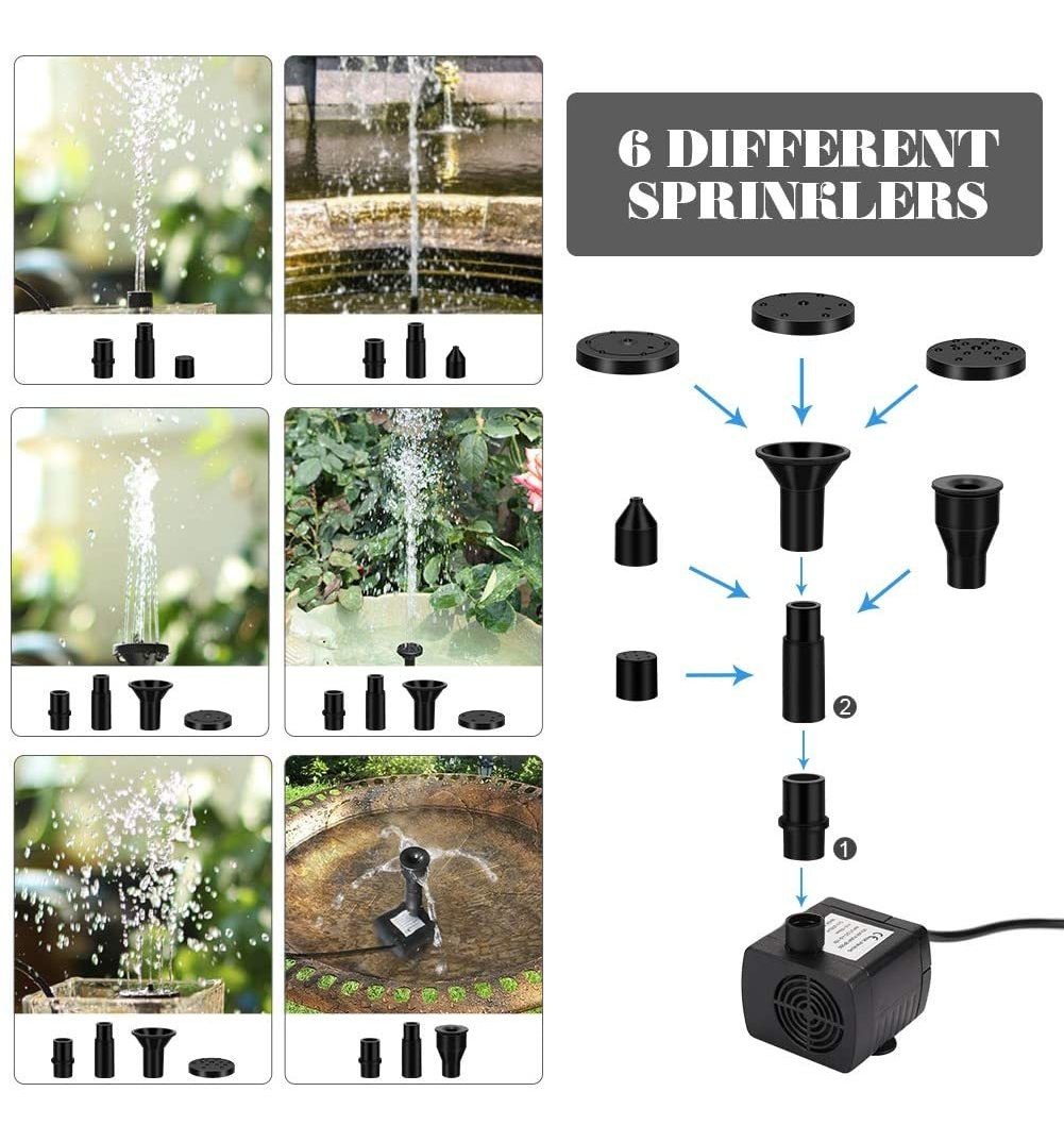 Panel solar de alta calidad Este solar de uso del panel fuente IP65 diseño del marco de la impermeabilización y protección. 6V 2W policristalino tecnología de laminado de vidrio. tecnología de expansión de vidrio se expande y se reduce la tasa de defectos de los productos. Equipado con cable de 3 m de largo. fuentes de la piscina también BLOOMWIN solares son CE, FCC, EMC, RoHS cetified, que es seguro utilizarlo .; Fuente solar para el bebedero para pájaros La bomba de agua solar para fuentes de agua ayuda activa, que proporciona ambiente de baño fresco y saludable para los peces y las aves. Nuestra fuente de agua solar adecuado para baño de aves, acuario, estanque o sondeo, decoración de jardín del patio y el oxígeno del agua circulaing .; Equipado con bomba sumergible sin escobillas La bomba solar para fuente de agua viene con varios filtros, que son fáciles de limpiar. La bomba solar para estanque utiliza un motor sin escobillas. En comparación con otras fuentes solares de bajo costo, tiene una mayor eficiencia, menor ruido y una vida útil más larga .; Entorno amigable Nuestras bombas de la fuente son alimentados por energía solar. La fuente del jardín solar tiene ninguna toma de corriente de la batería externa y completa impulsado por la luz solar. Viene con toma de tierra, puede ser enchufado en el suelo y también se utiliza en la pared. 180 ajuste del panel solar y la bomba es IP68 a prueba de agua. Sólo para satisfacer sus necesidades .; Cómodo de usar Deje que la bomba de la fuente solar de exponer a un lugar soleado y la fuente solar comenzará a trabajar dentro de los 3 segundos. Los métodos de instalación de la boquilla de 6 se utiliza para ajustar el flujo de agua y la altura del agua también rocían manera. Aerosol de agua altura: 40-60cm, el flujo de agua: 0-200L / H. Una mayor eficiencia y bajo nivel de ruido. Todos nuestros productos estan en inglés SKU 4032120209