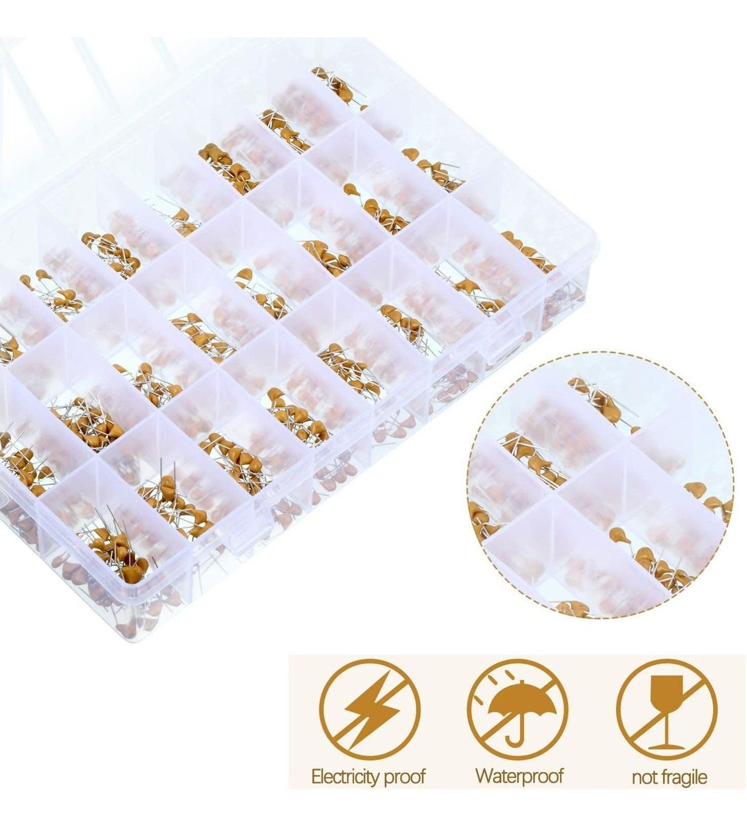 840 Piezas condensador surtido kit: 24 tipo capacitor diferente, incluido el intervalo 10pF a kit surtido 10uF, 35 piezas cada tipo, el total de 840 piezas, kit de cerámica condensador surtido monolítico gran cantidad para satisfacer sus demandas; gama de capacitancia: 10pF-10uF (100nF 0.1uF) condensadores de cerámica, las marcas de 10pF 10, marcas de 20pF 20, marcas de 30pF 30 etc., cada tipo tiene número específico en la superficie del condensador, se puede conocer el número a través de la etiqueta de la caja o la descripción del producto; Muy bien organizados: estos condensadores cerámicos están muy bien dispuestos en la caja de almacenamiento, sin divisiones removibles, por lo que sus tapas no se levante mixta, ayuda a mantenerlos en orden, fácil de almacenar y transportar; Fácil de usar: todos los condensadores están empaquetados en el orden del papel marcado, y el número de tipo le ayuda fácil de encontrar lo que necesita, proporciona una manera fácil para facilitar su afición o tareas de bricolaje electrónicos; el material fiable: este kit completo surtido condensador está hecho de material de calidad, buena resistencia a la humedad y un rendimiento fiable, buena para las reparaciones y proyectos pequeños 840 Piezas 24 tipos 50V condensadores kit condensador de 10pF surtido van a condensadores cerámicos 10uF kit de surtido con caja de almacenamiento para los pasatiempos electrónicos, de audio y video, reparación de automóviles y más