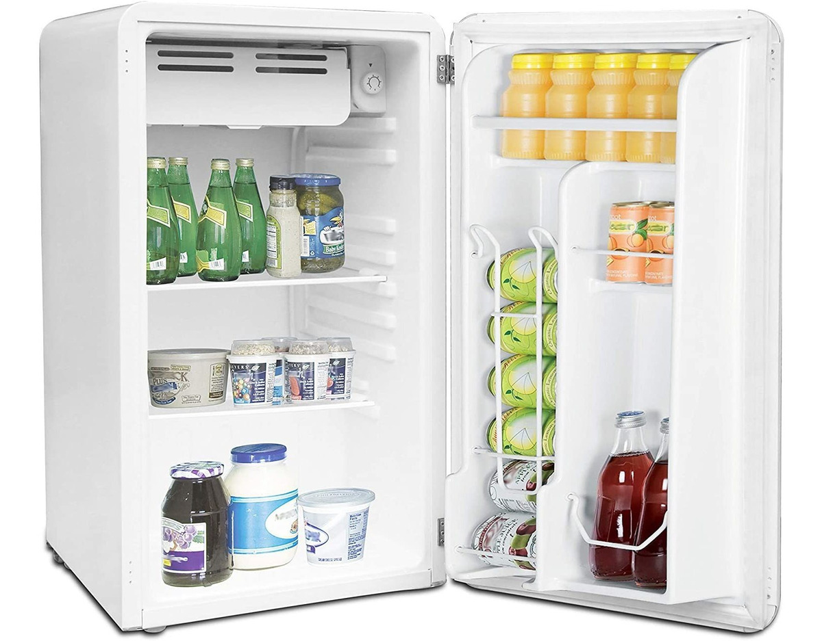 Refrigerador retro de 3.2 pies cúbicos con hermosa puerta redondeada y mango cromado; Abridor de botellas montado en gabinete; Almacenamiento de botellas de 2 litros en la puerta y dispensador de latas fácil de usar; Congelador interior/Cámara de hielo; Termostato ajustable Color:Blanco