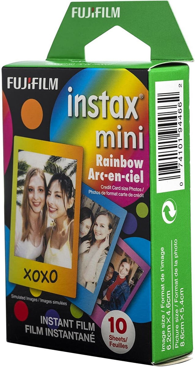 Instax Mini Arco iris de película de tamaño tarjeta de crédito característica de fotos instantáneas con diferentes bordes de color que se puede dejar en blanco y escribir un mensaje de la diversión personal. Instax Mini arco iris de la película asegura fuerte, reproducción clara, de colores vivos y tonos de la naturaleza de la piel. Para su uso en todas las cámaras instantáneas Instax Mini. Todos nuestros productos estan en inglés SKU 4022162429