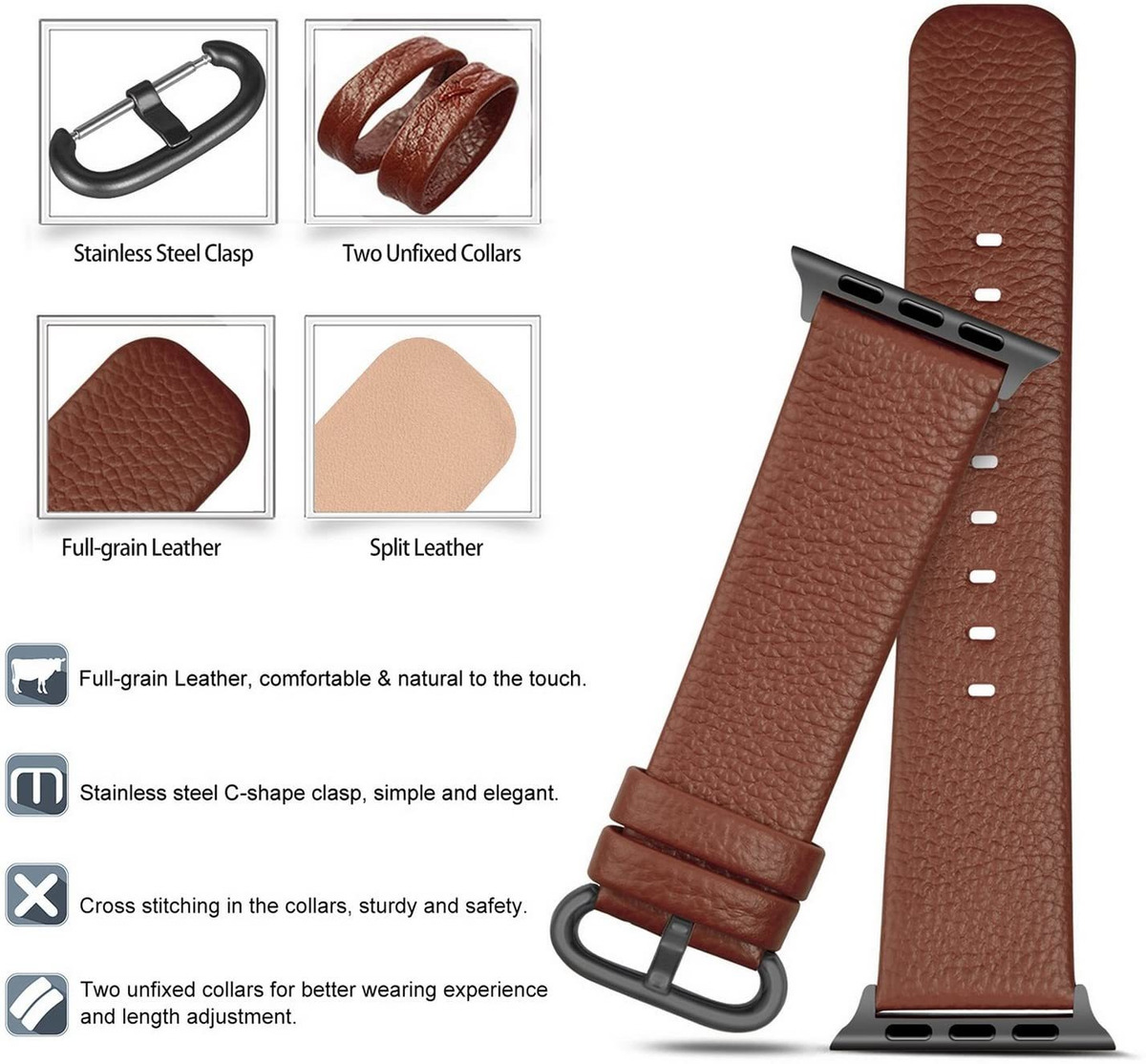 Piel auténtica de primera calidad: La correa Fullmosa para Apple Watch está hecha de piel de vaca, auténtica y de primera calidad, es suave en el interior pero firme y fuerte en el exterior. Está específicamente hecha para no irritarte la piel por el sudor y tiene un tacto cómodo. Si bien se desgasta con el tiempo, nunca pierde su calidad; Diseño único: La correa Fullmosa para iWatch está hecha de piel, lo que otorga un estilo moderno pero atemporal. La correa para iWatch está diseñada para llevarla en la mayoría de las ocasiones, ya que se convierte en el complemento perfecto para cualquier tipo de vestimenta. Incluye una hebilla de acero inoxidable. Gracias a sus conectores, esta correa puede cambiarse de forma práctica y fácil para disfrutar de muchos estilos diferentes. Esta correa para Apple Watch es compatible con Apple Watch SE y Series 6, 5, 4, 3, 2 y 1.; Tamaños de ajuste: Tamaños de la correa para Apple Watch: 42 mm/44 mm para muñecas de 6-8.5 pulgadas (15.24-21.59 cm); 38/40 mm para muñecas de 5.4-7.5 pulgadas (13.72-19.05 cm). Diseñadas para usar con Apple Watch SE y Series 6/5/4/3/2/1 Sport y Edition (2015, 2016, 2017, 2018, 2019, 2020). 42 mm/44 mm 10 orificios cortados con precisión; 38 mm/40 mm 9 orificios cortados con precisión. La correa puede ajustarse para adaptarse a tu muñeca; Fácil colocación: Nuestra correa para Apple Watch está equipada con adaptadores hechos especialmente para Apple Watch. Simplemente desliza el adaptador en la ranura de tu Apple Watch y tu reloj estará listo para usar. Se incluye una herramienta especial para quitar la correa antigua. No es necesario comprar ninguna herramienta por separado; Contenido del paquete: 1 correa compatible con iWatch para Apple Watch SE/6/5/4/3/2/1, 1 herramienta de barra de resorte, 1 manual del producto (idioma español no garantizado), 1 tarjeta de control de calidad Todos nuestros productos estan en inglés SKU 91221080938