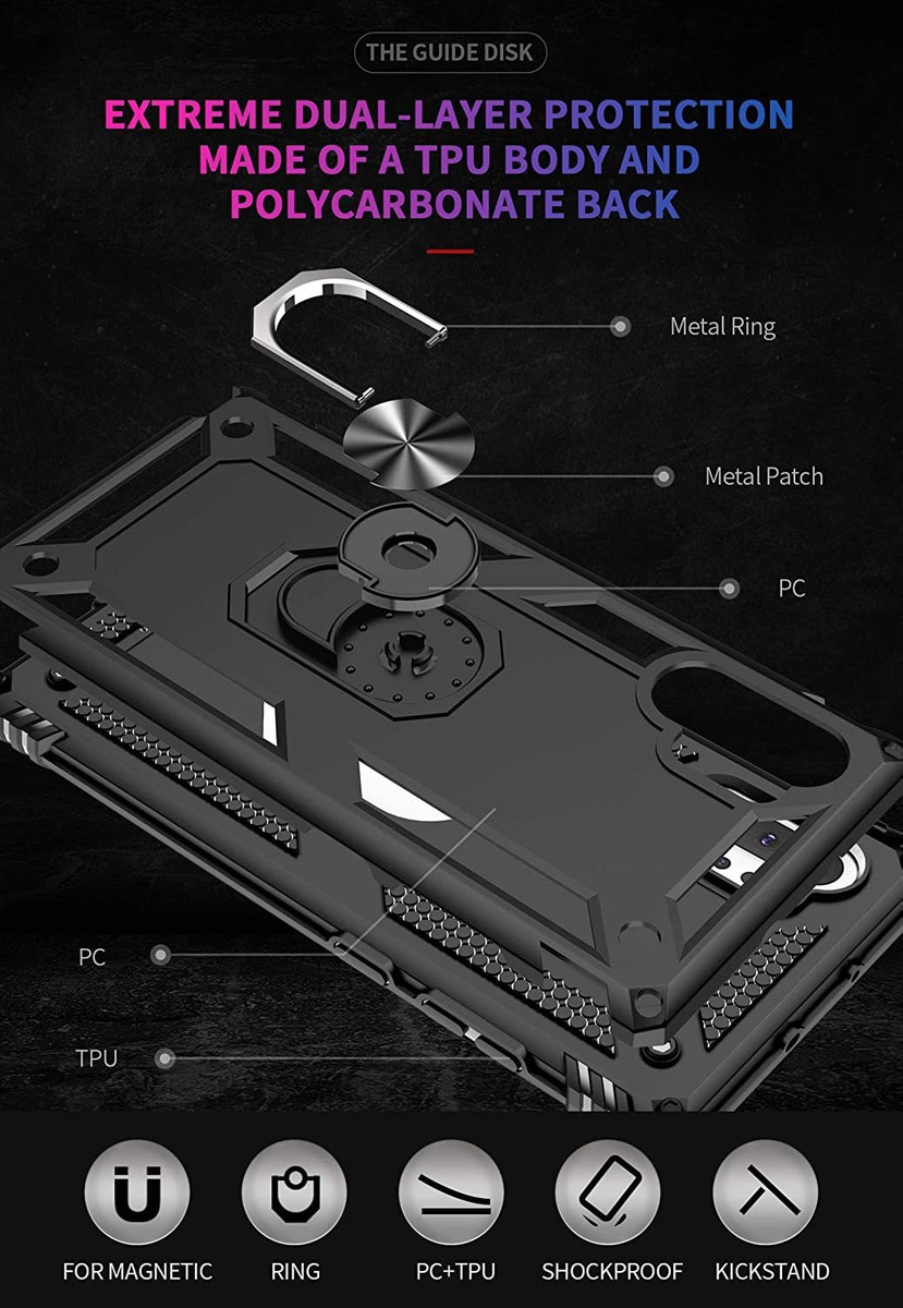 Esta es una funda de diseño de doble capa, pero es extremadamente compacta y elegante. El anillo de metal integrado que puede ser giratorio 360 funciona perfectamente como un agujero o un soporte. Además, la placa de metal para sujetar el anillo se puede fijar fácilmente al soporte magnético de tu coche o soporte cuando conduces. Disfruta de tus momentos de manos libres para ver un video o Facetime con la funda de la serie Super Ring de Androgate.