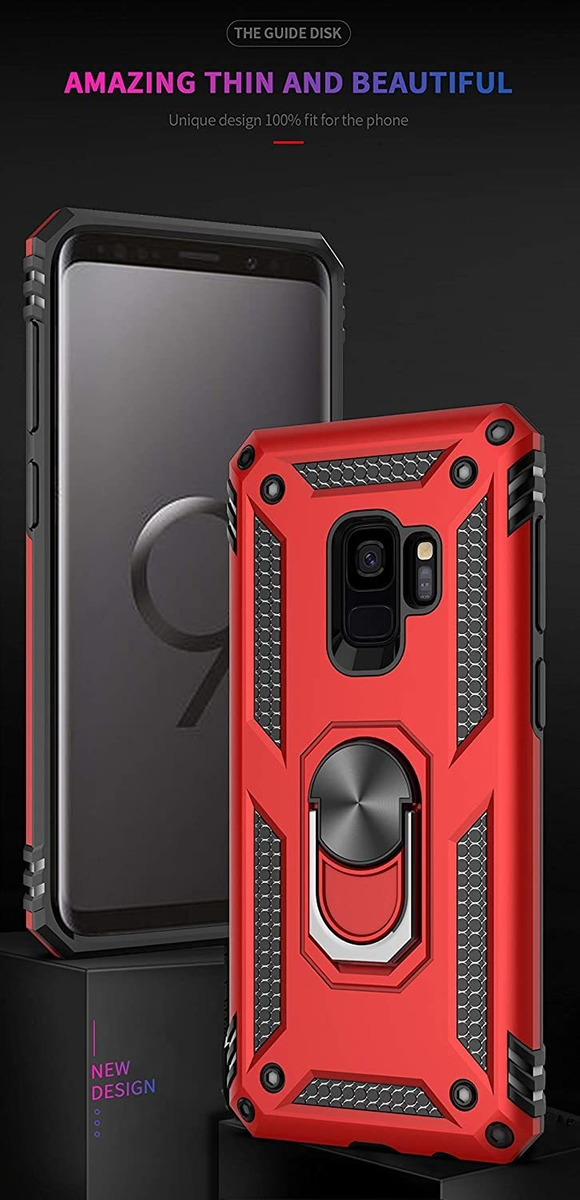 1 funda para teléfono y 2 protectores de pantalla: diseñado a medida para Samsung Galaxy S9 (solo para el tamaño normal S9); Fuerte protecciónCombinación de TPU y policarbonato con esquinas reforzadas para protección de grado militar contra caídas y golpes. Los biseles elevados proporcionan protección adicional a la pantalla y la cámara.; Recortes precisos: fácil acceso a botones, altavoz, puerto de carga y todos los demás puertos operativos del Samsung Galaxy S9; Soporte de anillo de metal y soporte: el anillo de metal es una gran ventaja en múltiples escenarios cuando funciona como un soporte, soporte o soporte. La hoja de metal magnética integrada permite una fácil fijación al soporte magnético de tu coche; Perfil compacto y elegante: la funda del teléfono está hecha de material antideslizante ligero seleccionado para garantizar una protección delgada y resistente con un agarre mejorado. Color:Rojo