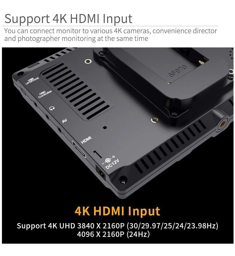 Pantalla IPS de 7 Pulgadas, Resolución Ultra HD1280x800, Brillo: 400 cd / m2, contraste: 800: 1, relación de aspecto: 16:10, tono de punto: 0,11775 (H) x 0,11775 (V) mm, tiempo de respuesta: 25 ms; Formato de Soporte: 4K UHD 3840 2160p (30 / 29,97 / 25/24 / 23.98Hz), 4.096 2160p (24Hz), 480i / 576i / 480p / 576p, 1080i (60 / 59,94 / 50), 720p (60 / 59,94 / 50/30/29/25/24 / 23.98), 1080p (60 / 59,94 / 50/30 / 29,97 / 25/24 / 24sF / 23,98 / 23.98sF); Diseño ultradelgado y ligero, diseño delgado de 0.669 en, luz portátil compatible con Cámara estable, cámara réflex digital, kit de Videocámara, estabilizador de mano, grúa de cámara de vídeo .; Características Avanzadas: Pico de ayuda de enfoque, Check Field (rojo, verde, azul, mono), modo de cámara, pixel a pixel Centro marcador, marcador de la pantalla (80%, 85%, 90%, 93%, 96%, 2,35: 1), flip Image (H, V, H / V), congelación de imagen, color de encargo Temperatura .; El paquete Incluye: 1 monitor de FW759, 1 cable mini HDMI, 1 sombrilla, 1 Soporte para zapata caliente, 1 placa de Bateria F970, 1 bloqueo de enchufe HDMI, 1 manual de Instrucciones (idioma español no garantizado). Nota: La Batería No Está Incluida. Un año de Garantía Somos la tienda oficial de Feelworld, Si tienes CUALQUIER PREGUNTA, simplemente hay tíos en ponerte en Contacto con Nosotros, HAREMOS Todo Para Posible lo ayudarte un resolver El problema. Nota: No incluye La Batería En El producto, Pero PUEDES Elegir Una de las Placas de Bateria a tu Voluntad, a favor por, obs rápido Cuál de la Placa de Bateria Quieres Obtener, si no lo observas, te daremos Una placa de Bateria Estándar F970.