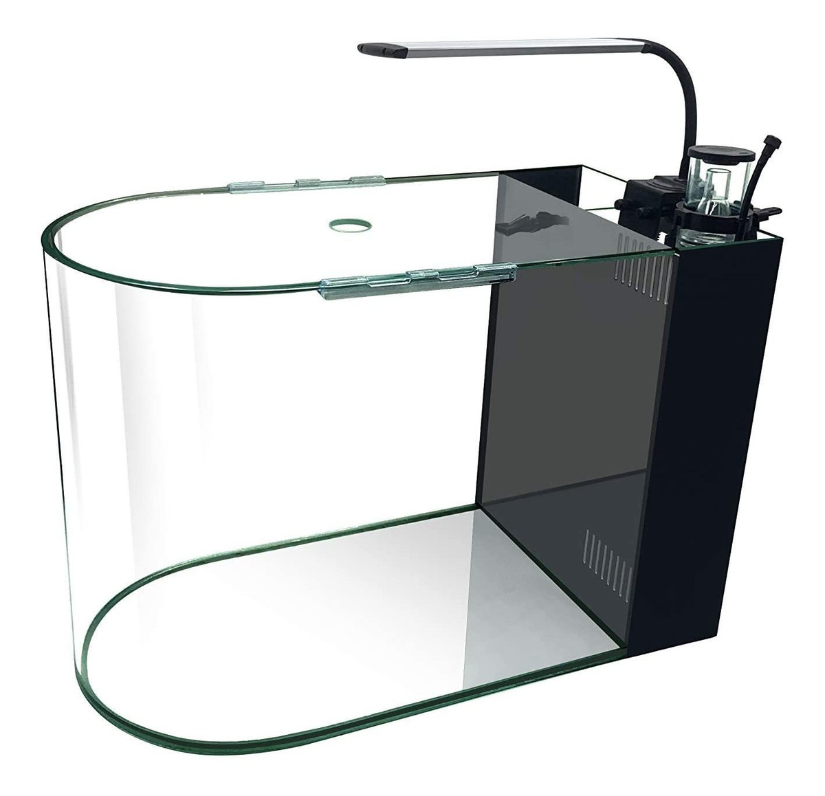 12 galones Bullnose Forma Ultra claro Cristal de cristal acuario (diseño de bala) para peces de agua salada, arrecife y coral. Área de filtración trasera de 2 galones más área de visualización delantera de 10 galones. L: 20.5 x W: 10.75 x H: 14 pulgadas; Equipado con medios de filtro mecánico bioquímico, bomba ajustable y skimmer de proteína para mantener su tanque limpio y proporcionar un ambiente perfecto para peces, arrecifes y coral.; El tanque cuenta con una luz LED de aleación de aluminio para resaltar su pescado, arrecife y coral. La luz LED tiene 3 modos de color, 5 niveles de nivel regulable y temporizador de auto-apagado, lo que ayuda a crecer el coral.; El kit de acuario completo incluye: Aquarium de 12 galones, lámpara LED de aleación de aluminio, bomba de alimentación silenciosa, skimmer de proteína de hasta 13 galones, calentadores, termómetro digital LCD, dos esponjas de filtración bioquímica y un paquete de anillos de cerámica.; Este acuario está hecho de cristal ultra claro (vidrio de hierro bajo). Este tipo de vidrio es el vaso más claro del mundo. Es mucho más claro que el vidrio regular; Fácil de configurar para el arrancador del acuario de agua salada. Todos nuestros productos estan en inglés SKU 10032234398