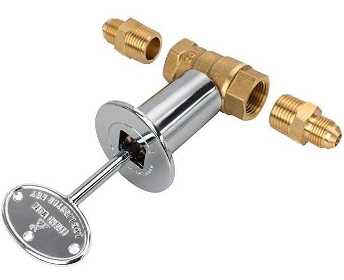 cierre de gas directamente de kit de la válvula con la válvula de bola de cuarto de vuelta estándar; Recomendado para 90.000 BTU; Un medio de entrada de pulgadas y de salida con roscas estándar NPT hembra; Chrome Brida cuerpo de bronce, para una larga vida; Tenemos ofrecen dos 3/8 macho acampanado x 1/2 NPT Herrajes para su conveniencia El paquete incluye:
