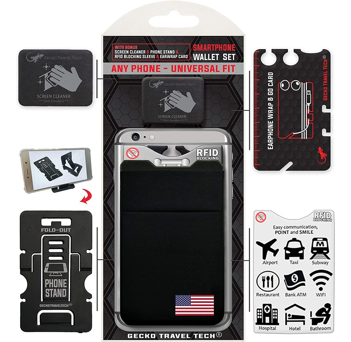 Los juegos de cartera para teléfono de Gecko vienen con una cartera y mucho más: una cartera para teléfono Gecko, soporte para teléfono, 1 funda para tarjeta RFID, desenredador de auriculares y un limpiador de pantalla de microfibra. Gecko se envía desde Estados Unidos y ofrece respuestas de servicio al cliente en menos de 24 horas, respaldamos nuestras carteras de teléfono Gecko durante 90 días.; Los juegos de tarjetas de teléfono de Gecko son universales, pueden adaptarse a casi cualquier teléfono o funda, los juegos de fundas Gecko son un gran regalo para cualquier persona con un teléfono celular. Los bolsillos para teléfono Gecko están hechos para contener 2-3 tarjetas y un poco de dinero en efectivo. Una funda delgada y elegante que hace que el minimalista sea feliz.; Soporte de tarjetas seguro y privado para la parte trasera de teléfonos y tarjetas hecho por Gecko incluye una correa de seguridad integrada en la parte superior del bolsillo para que nunca tengas que preocuparte por perder tus objetos valiosos. Las carteras para teléfono son extra altas para que tus tarjetas de crédito y dinero en efectivo nunca se muestren. Dimensiones: 3.780 in de alto, 2.362 in de ancho, 0.079 in de grosor; Las fundas tipo cartera son accesorios de viaje para pegar fácilmente en la parte posterior de los teléfonos celulares, nuestro material de licra duradero (no silicona) puede estirarse y sostener cualquier cosa como un bolsillo cómodo. Tienes prisa Ahorra tiempo con acceso rápido a tus tarjetas de crédito y dinero en efectivo. Elimina tu voluminoso bolso o cartera y simplemente utiliza tu teléfono.; Soporte para tarjetas de teléfono celular, soporte adhesivo para tarjetas de crédito, bolsillos para teléfono celular para tarjetas de crédito, funda de cartera, soporte para tarjetas adhesivas, funda de tarjetas, tarjetas de teléfono, va con muchos nombres, solo lo llamamos un GECKO Todos nuestros productos estan en inglés SKU 91221082497