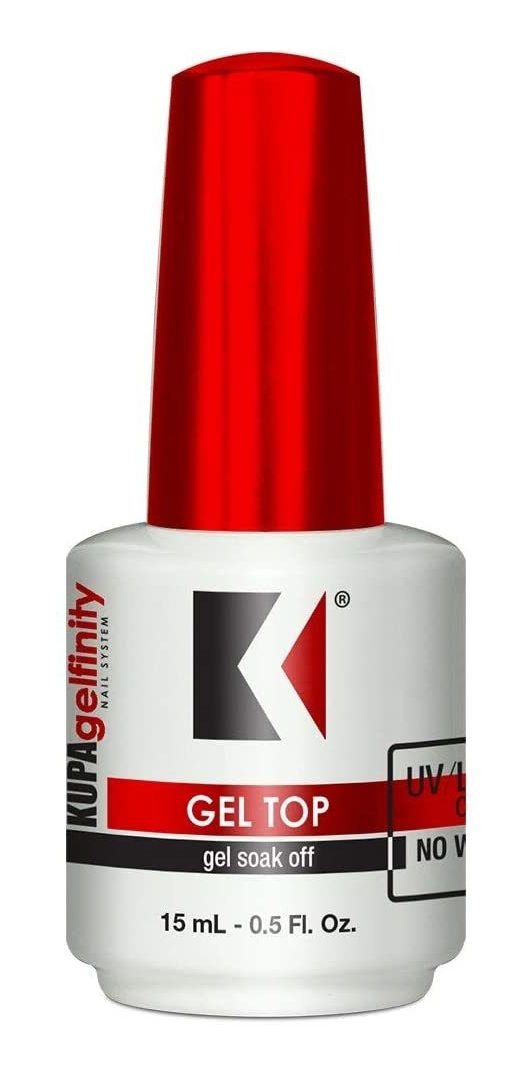 GelFinity Gel Top Seals Soak-Off gel polish to a high gloss shine that will not fade, chip or peel. Cures to a no-wipe finish. To remove soak-off with acetone or polish remover. Cures 90 seconds in your KUPA GelFinity UV/LED Hybrid Light or 2 minutes in a standard UV Light. Todos nuestros productos estan en inglés SKU 91221047836