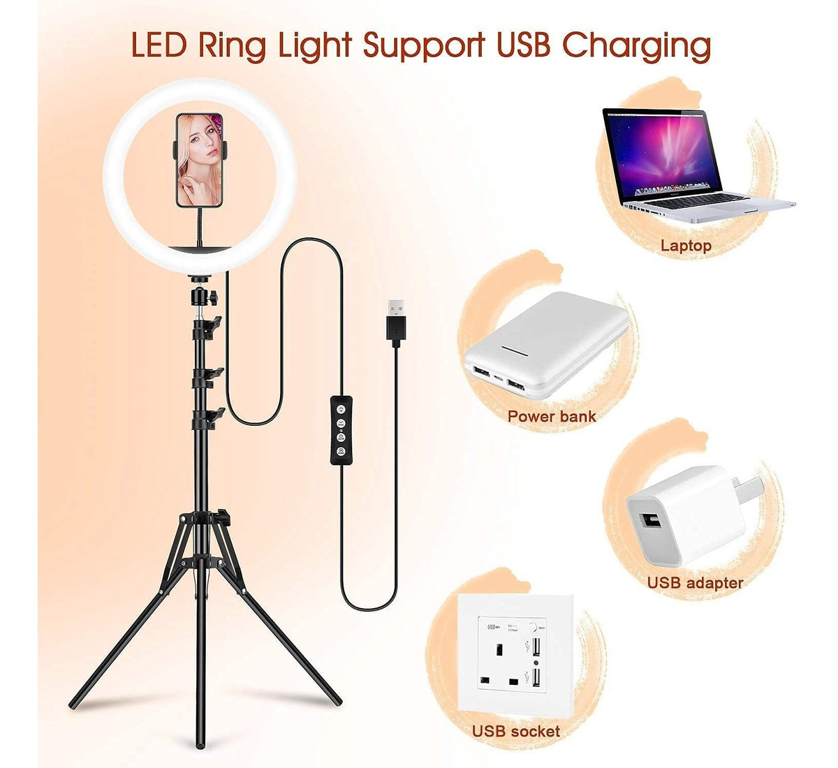 Upgraded Dimmable 12.6 inch Ring Lights: outer/inner diameter : 12.6 / 10. Ring light with stand have 168pcs advanced led lamp beads for long life without changing bulbs, 2800K to 6500K color temperature, 3200LM lumen, UV free, flicker free, no ghosting, no glare, durable, and safe for your skin; The curved LED light cover makes the light softer, more effective and wider; More than 150 Settings 10 Colors: RGB ring light with 3 daily light (white, warm white, warm yellow) and 7 RGB colors (red, green, blue, yellow, purple, cyan-blue, colorful), each mode has 13 brightness with 1% to 100% dimming range to create a unique atmosphere; phone ring light with unique 12 kinds of RGB dynamic modes with multiple settings make your photos and videos more creative; Come discover more 150 dreamy colors; Adjustable Desk/Floor Ring Light: ring light tripod adopts quick flip locks and weighted tripod base for increased stability so it wont tip over, extend from 15.4 to 59 that is tall enough to stand on the ground and one mini tripod to stand on the tabletop; The ring led lamp perfect for selfie, making up, tik tok, live streaming, shooting fill light, filming, taking photos, vlogs, studio, video conferencing, youtube, zoom, blogger, reading books; Wide Phone Holder Flexible Hose: halo light ring with stand extends 2.2 to 3.4 phone clip compatible with almost ALL smartphones; With the flexible design, you can twist and bend it to reach an optional angle, multi-angle adjustable rotation ball head, freely adjust the angle of the selfie light ring. International universal standard screw M1/4 in, ring light for camera, smart phone; USB Powered: Your ios/android smartphones can take picture and shoot video with this light ring with stand; Desk video light with 2m long USB cable, very convenient to use and works with most devices that support usb port, like USB charger, mobile power, computer host, laptop, AC adapter; Any problems within 180days, please contact at first, we will make up for your losses, so that you have no risk of buying Todos nuestros productos estan en inglés SKU 91221079258
