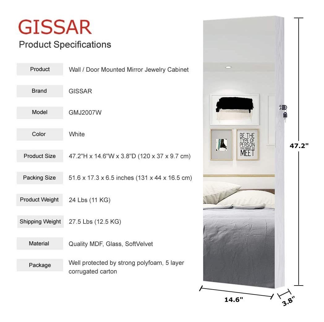 Luz LED y BLOQUEABLE GABINETE: 6 automático de encendido y apagado del LED luces alimentado por 3 baterías AAA (no incluidas), por lo que este gabinete le ayuda fácilmente a elegir el derecho de la joyería; guardar las joyas seguro y lejos de los niños con la cerradura; PARED Y PUERTA DE MONTAJE ARMARIO: disponible al colgar el gabinete de la joyería en la puerta con ganchos, también se puede montar en la pared con tornillos para ahorrar espacio en el suelo; INTEGRAL ESPEJO: la larga duración del frontales medidas espejo 47 x 14 pulgadas, tamaño perfecto para que pueda comprobar su equipo de pies a cabeza cuando se está preparando y la aplicación de maquillaje; Amplio espacio de almacenamiento: diseñado especialmente para almacenar todos sus collares, pendientes, anillos, pulseras, relojes, corbatas, cosméticos para el cabello y otros accesorios, Tamaño decente: tamaño total: 47.2 H x 14.6 W x 3.8 D (120 x 37 x 9,7 cm) Todos nuestros productos estan en inglés SKU 6102024876