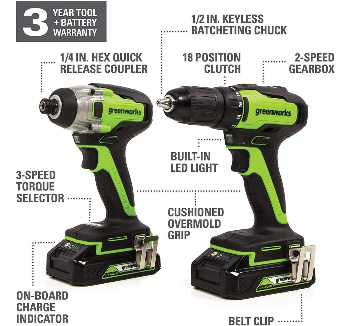batería Greenworks 24V de iones de litio proporciona el 20% más de potencia y un 35% más de tiempo de ejecución, y entrega energía libre de desvanecimiento sin pérdida de la memoria después de la carga; Altamente eficiente motor sin escobillas ofrece más par motor, un funcionamiento silencioso y una vida más larga; Incluye 24V medio de escobillas taladro / atornillador, 1/4 Conductor sin cepillo de impacto, (2) baterías, cargador y bolsa..; Taladro / destornillador:. 1/2 en el mandril de trinquete sin llave, caja de cambios de 2 velocidades (0-380, 0-450 RPM), 310-in-lbs. de par motor, 18 de posición de embrague; Atornillador de impacto:. 1/4 en hex acoplador de liberación rápida, control electrónico de velocidad variable (3 velocidad), (0-380, 0-450 RPM) y 2666-in-lbs. del par de torsión; Conveniente luz incorporada LED para trabajar en espacios mal iluminados; Acolchado agarre overmold para mayor comodidad y un control superior; clip para el cinturón incluido le permite liberar sus manos mientras que completan otras tareas a la mano; puerto USB en la batería carga todos los dispositivos electrónicos portátiles, como teléfonos y tabletas. Estación de corriente USB portátil de la batería (9000 mAh Banco de alimentación) Tamaño: 2 x 1.5Ah pilas incluidas | Estilo: Taladro / conductor atornillador de impacto