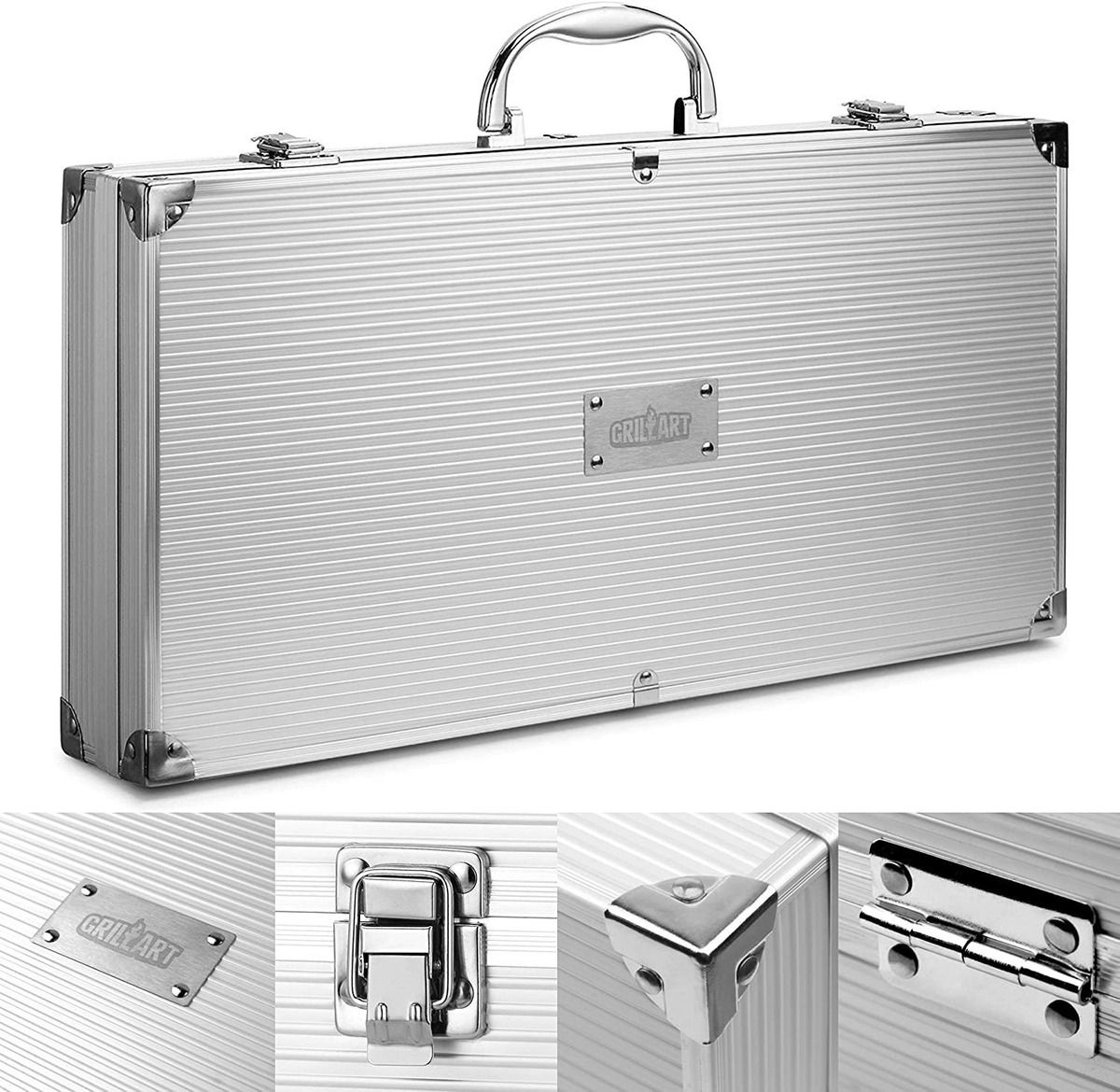 El kit más completo: este juego de utensilios de parrilla incluye 1 pinza, 1 tenedor, 1 cuchillo, 1 cepillo de parrilla, 1 cepillo para untar, 4 brochetas, 8 soportes de maíz, 1 cabezal reemplazable de cepillo de parrilla y 1 espátula que tiene 4 funciones (con destapador integrado y cuchillas de ablandador de carne). Son accesorios completos y profesionales para parrilla que contiene casi todo lo necesario para asar.; Material prémium: los utensilios para parrilla de Grillart están hechos de acero inoxidable de grado profesional que resiste el calor y aguanta la prueba del tiempo. A diferencia de los utensilios hechos de madera o metales de baja calidad, los nuestros no se agrietan, oxidan ni queman.; Diseño especial: nuestro principal propósito de diseño es que sea fácil de usar. Las pinzas reforzadas para parrilla pueden enganchar fácilmente los alimentos y no son fáciles de doblar. La espátula es una herramienta multiusos 4 en 1, que incluye espátula ranurada con cuchillas ablandadoras de carne y destapador integrado. Las asas de acero inoxidable alargadas mantienen tus manos a una distancia segura de la llama mientras estás asando. Los anillos colgantes en la parte superior de cada mango permiten fácil almacenamiento durante la temporada baja.; Portátil y conveniente: nuestro juego de utensilios para parrilla viene con un delicado estuche de aluminio para fácil almacenamiento y transporte. El maletín de transporte de aluminio es ligero y garantiza el almacenamiento adecuado de los utensilios y la seguridad de los utensilios en su ubicación exacta. Puedes cargarlo fácilmente.; – – – Haz clic en el botón Agregar al carrito ahora. Considera comprar dos: una para ti y otro para tu mejor amigo. Sé profesional al usar los 19 utensilios para parrilla de acero inoxidable de Grillart.