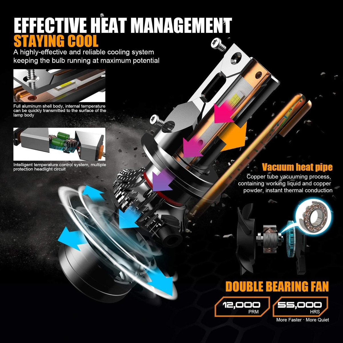 LED de alta luminosidad H7 bombillas de los faros, los chips de CSP LED, 55W por bombilla, alta eficacia luminosa flujo hasta 9000 LM por bombilla, Incluso patrón de luz sin ningún punto oscuro, brillante centro ligero estupendo; sistema de refrigeración eficiente, ventilador, chip de control inteligente de la temperatura de enfriamiento de alta velocidad está integrada en el controlador, las aletas de la base y el tubo central de calor están diseñados para una mejor disipación de calor; Enfoque diseño de la luz, El poste de la lámpara con un reflector hace que producen luz más centrado reflejar a la parábola del faro, a continuación parábola del faro reflejan las luces más atento a la carretera; diseño de fácil instalación, el diseño ajustable collar de montaje permite ajustar de distribución de la luz correcta para su vehículo, ventilador compacto hace que sea apto para la mayor parte de la cubierta del coche de polvo original; La interferencia anti-radio, el controlador está integrado en el sistema de EMC, uso cable de alimentación escudo para reducir la posibilidad de interferencias de radio, IP68 a prueba de agua tasa de asegurarse de que funciona bien incluso con mal tiempo Tenga en cuenta amablemente, algunos vehículos tienen su retención específica para sostener la bombilla en la carcasa del faro, si este es su caso, puede que tenga que comprar un par de retención por separado para fijar la bombilla, que no incluyen estas retención específico en el paquete , ya que no todos los modelos solicitan retenedor, y diferente modelo de solicitud de retención diferente