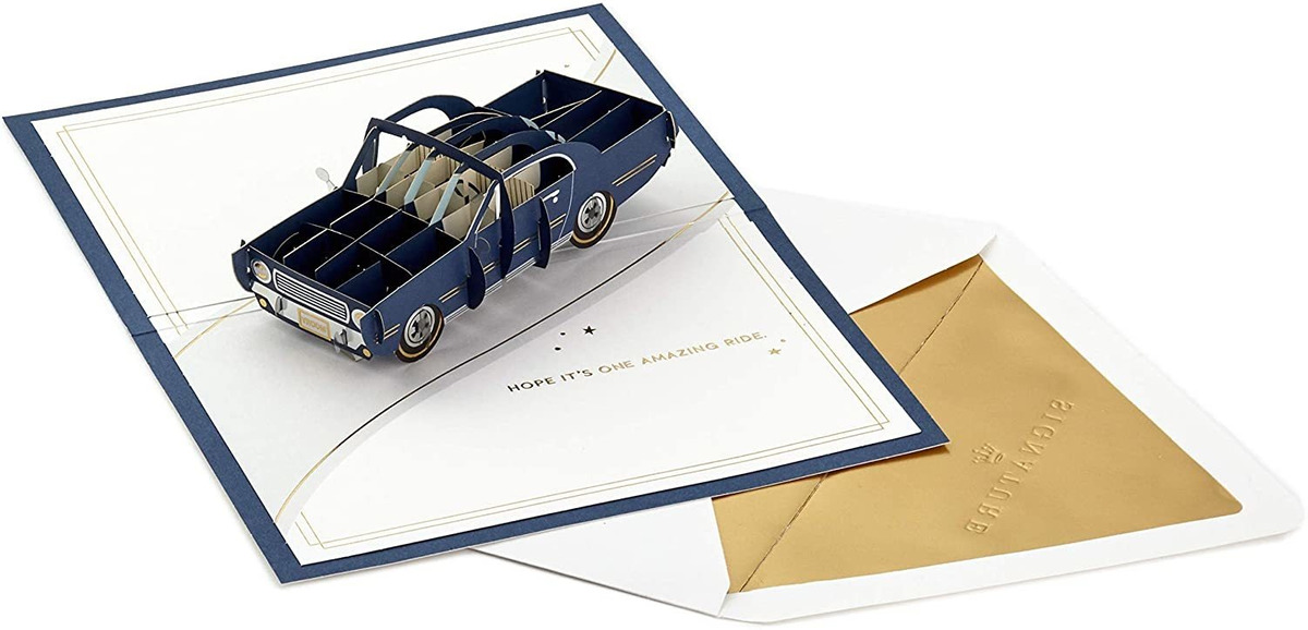Desea a amigos o familiares locos un día muy feliz con una impresionante tarjeta que seguro apreciarán.; La cubierta azul cuenta con detalles de aluminio y letras que dice: Its your day. El interior cuenta con una elaborada sorpresa emergente de un coche vintage y el mensaje en inglés: Hope its one amazing rid; Con un diseño emocionante y un sentimiento sincero, esta tarjeta desplegable es la manera perfecta de enviar lo mejor a un hermano, hermana, padre o amigo.; La tarjeta desplegable mide 5.0 x 7.2 in y viene con un sobre a juego. Impreso en papel de alta calidad, las tarjetas ecológicas de Hallmark están hechas con papel de bosques bien gestionados.; Hallmark Signature ofrece a los compradores elegantes una línea de tarjetas y regalos exclusivos y únicos que reflejan su estilo personal y crean una impresión inmediata y duradera. Color:Pop Up, coche clásico, increíble paseo