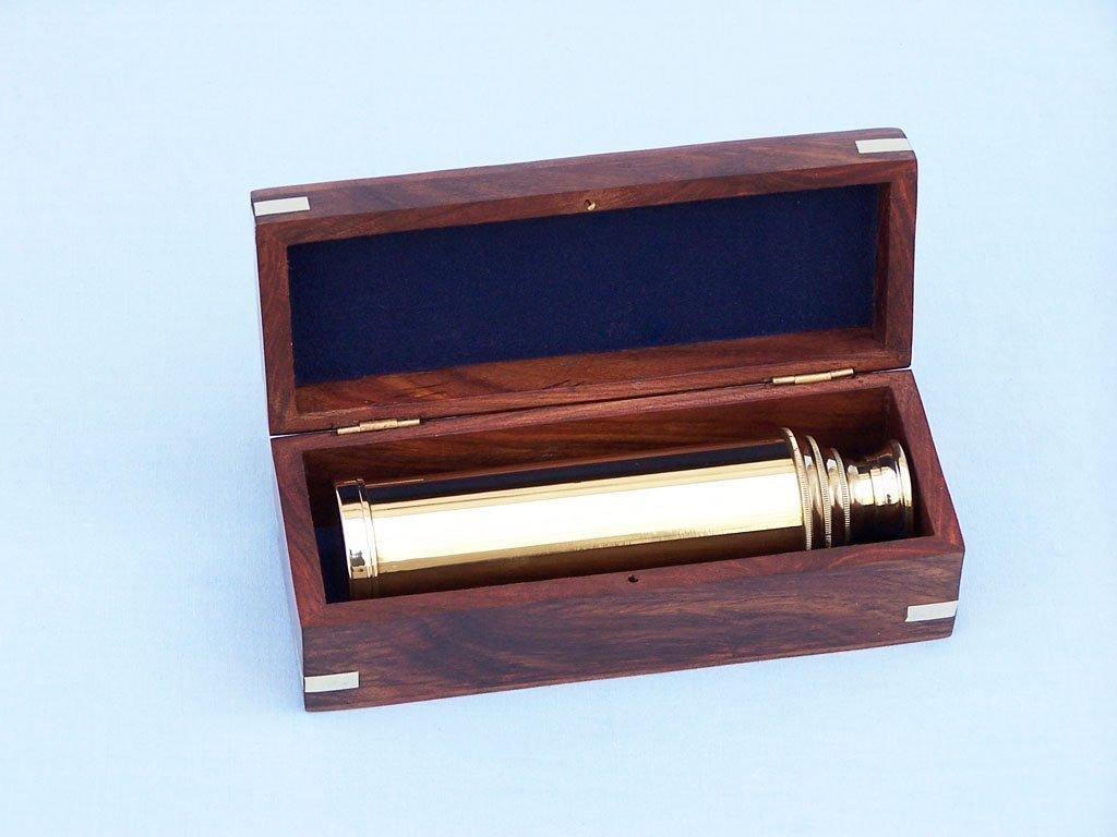 Aumento de 10 x; Óptica de vidrio Para Una vista clara (sin lentes de plástico); Totalmente funcional de latón macizo Enfoca catalejo y aumentos; Caja Sólida de madera de palisandro adornado con emblema de anclaje de latón; Dimensiones: 15″ L x 2″ W x 2″ H Descripción del producto