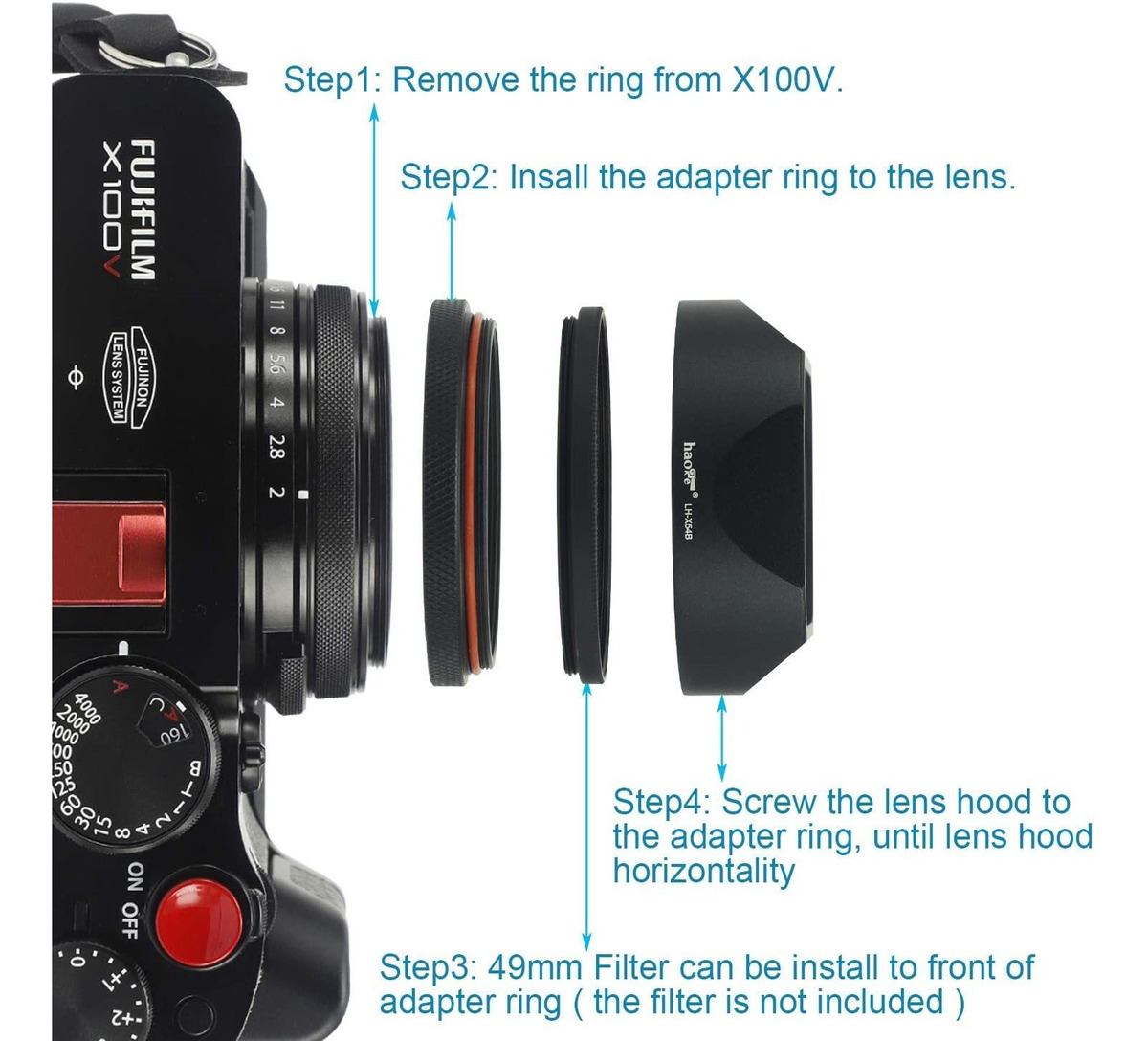 Haoge LH-X54B – Parasol cuadrado de metales especialmente Diseñado para Cámara Fujifilm X100V .; Acabado antirreflectante compañero Que evita los reflejos .; Ayuda a bloquear la luz y los reflejos .; La tapa original de Fujifilm Se Puede montar en la lente .; No Afecta al USO de filtro UV de 1.929 pulg. (Nota: el diametro sin EXCEDE los 2,047 in). Haoge LH-X54B – Parasol de metal de cuadrado especialmente Diseñado para Cámara Fujifilm X100V. El parasol de la lente sombrea la lente de la luz desviada, o Previene Limita el destello de la lente, de mejorando su contraste y Calidad de Imagen. Proporciona Protección Adicional a la Camara Y lente de arañazos accidentales.