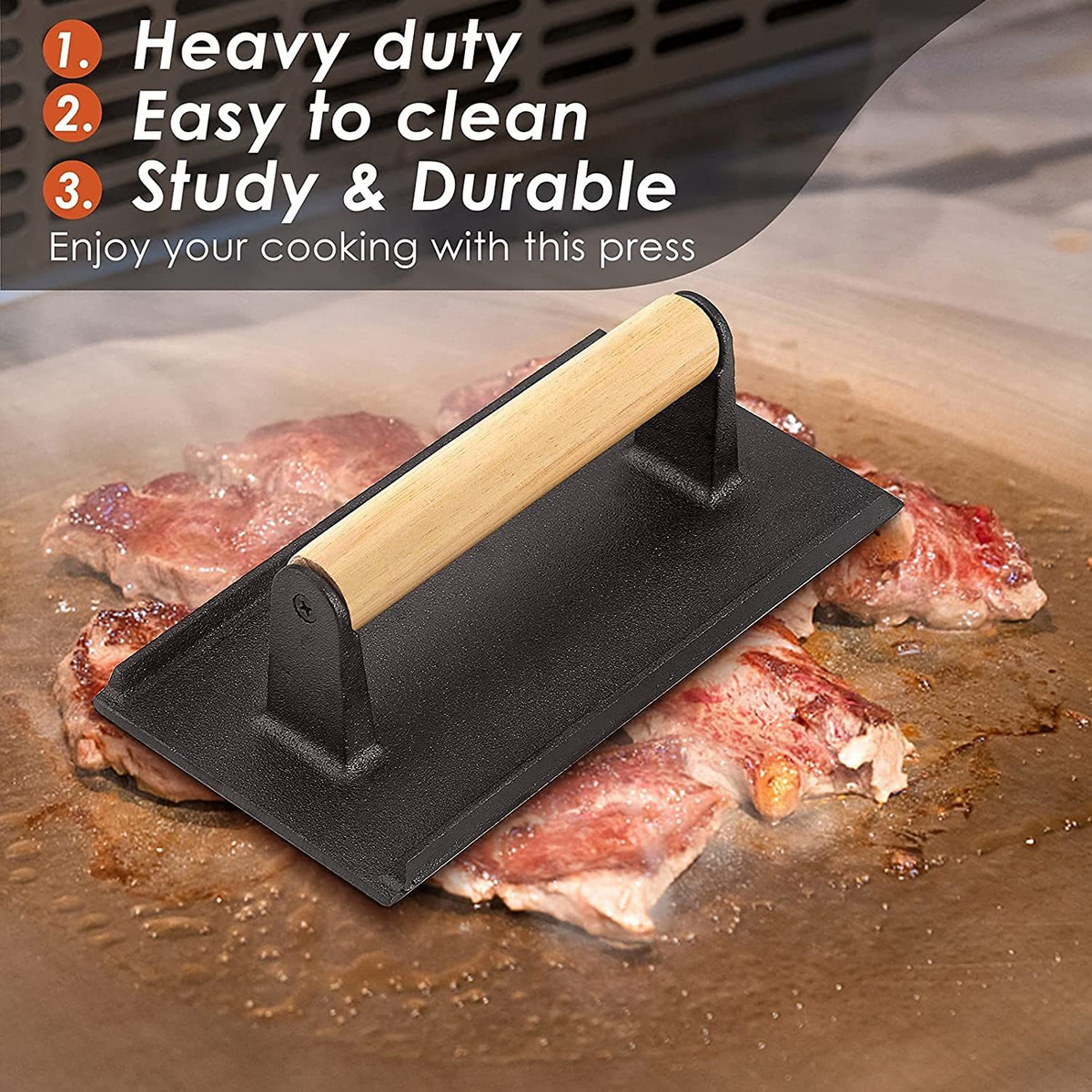 La prensa de tocino para hamburguesas de hierro fundido está hecha de peso de hierro fundido resistente de hasta 2.2 lb para evitar productos químicos dañinos de PTFE o PFOA, construcción robusta y duradera para uso diario. La superficie lisa sin huesos es muy fácil de limpiar.