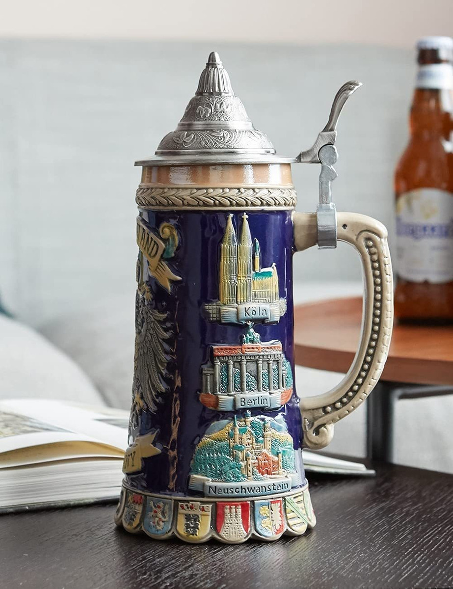 El diseño Este barril de cerveza de cerámica con temática alemana cuenta con un detallado grabado alemán escudos de brazos y alivio de atracción. No es solo una taza de cerveza real, sino que también se puede utilizar como decoración.; Taza de cerveza: mantén tu cerveza fría para los amantes de la cerveza, o tu café o té caliente, en este vaso de cerveza premium que viene con un práctico mango para sostener, aporta comodidad y comodidad independientemente de que tu palma sea grande o pequeña.; Calidad prémium: 9.4 in de alto y 0,6 litros de volumen. La taza de cerveza está hecha a mano y pintada a mano, hecha de cerámica de la más alta calidad. Tapa de Petwer 100% sin plomo.; Regalo perfecto: empaquetado en caja de regalo. Es un excelente regalo para los amantes de la cerveza en vacaciones, Navidad, Pascua y Día del Padre. También un recuerdo muy significativo y bonitas tazas de cerveza para hombres, padres y amantes de la cerveza.; 100% GARANTIZADO- Garantizamos un 100% devolución y reembolso completo si tienes cualquier insatisfacción con el diseño o tamaño. Te responderemos lo antes posible y resolveremos tus problemas. Todos nuestros productos estan en inglés SKU 91221042225