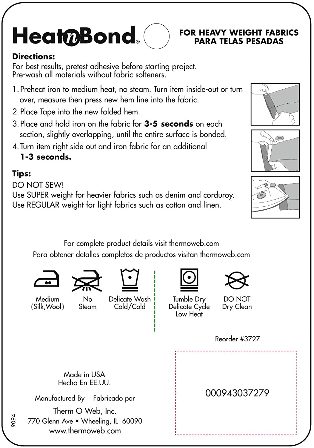 Especificaciones: HeatnBond Dobladillo adhesivo para planchar, superpeso, 3/4 pulgadas x 8 yardas, negro