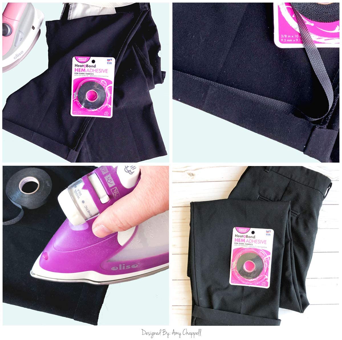HeatnBond Hem es un rollo de adhesivo termoadhesivo de doble cara para dobladillos fáciles y permanentes de prendas y decoración del Home & Kitchen sin necesidad de costura.