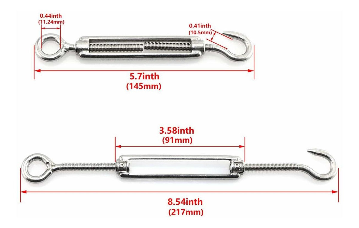 Tipo: gancho y ojo; Tamaño estándar: M5 / M6; M6 Longitud: 145 217mm; tamaño Eyebolt: 11.24mm; Uso: Adecuado para apretar tensa la cuerda, y regular el efecto elástico .; Seguridad: Hecho de acero inoxidable 304, resistencia a la corrosión, larga vida útil para una máxima resistencia a la corrosión y durabilidad .; El paquete incluye: 4 x gancho y ojo tensores Tamaño: M6