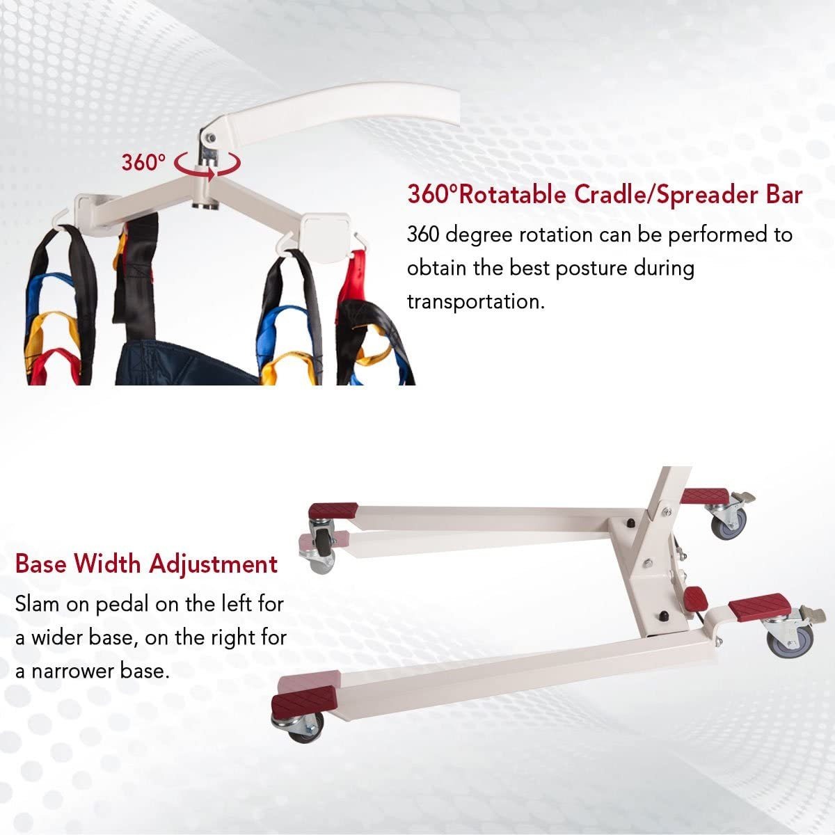 La capacidad de carga máxima es de 449.7 lbs. Rango de elevación: 33 a 68 pulgadas. Rango máximo de horquilla: 32 pulgadas. Peso neto: 99 libras. Contiene componentes fáciles de montar y desmontar para guardar y transportar; El diseño de cuello de cisne con ancho ajustable se adapta alrededor de muebles grandes para una transferencia más segura y fácil del paciente, es un elevador para uso doméstico; Prácticos controles de mano con botón y patas ajustables con pedal trasero que se pueden operar con el pie. Simplemente pisa el pedal izquierdo para ampliar la base, o pisa el pedal derecho para una base más estrecha. Las ruedas traseras se pueden bloquear para mayor estabilidad; Eslinga de elevación gratis: barra separadora de cuatro puntos para la vida más segura y cómoda posible. Transfiere fácilmente de la cama a la silla de ruedas, sillón reclinable o silla de ducha, o de sofá a cama. El tamaño grande del cabestrillo puede acomodar todos los tamaños de pacientes. Hecho de poliéster que se puede utilizar en seco o húmedo; 1 año de garantía en el marco, 6 meses de garantía de reemplazo en actuador, caja de control y controles manuales. Confirma la potencia después de recibir el producto. Si la batería está baja, cárgala antes de usarla. Además, el elevador no se puede utilizar mientras se carga Todos nuestros productos estan en inglés SKU 4022241080
