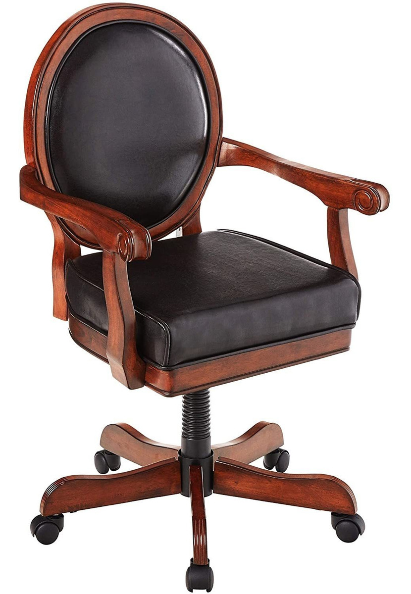 Acabado en cerezo rico con cuero marrón encolado, los respaldos circulares de inspiración náutica y los reposabrazos señoriales de la silla Warrington Game Chair de Hillsdale Furniture traerán elegancia francesa moderna a su oficina, sala de estar, sala de juegos o guarida. Ruedas robustas, altura ajustable del asiento y giro de 360 grados significan que usted y sus invitados estarán sentados con la máxima comodidad para conversar remachado y una gran diversión. Requiere montaje. Todos nuestros productos estan en inglés SKU 17082129046