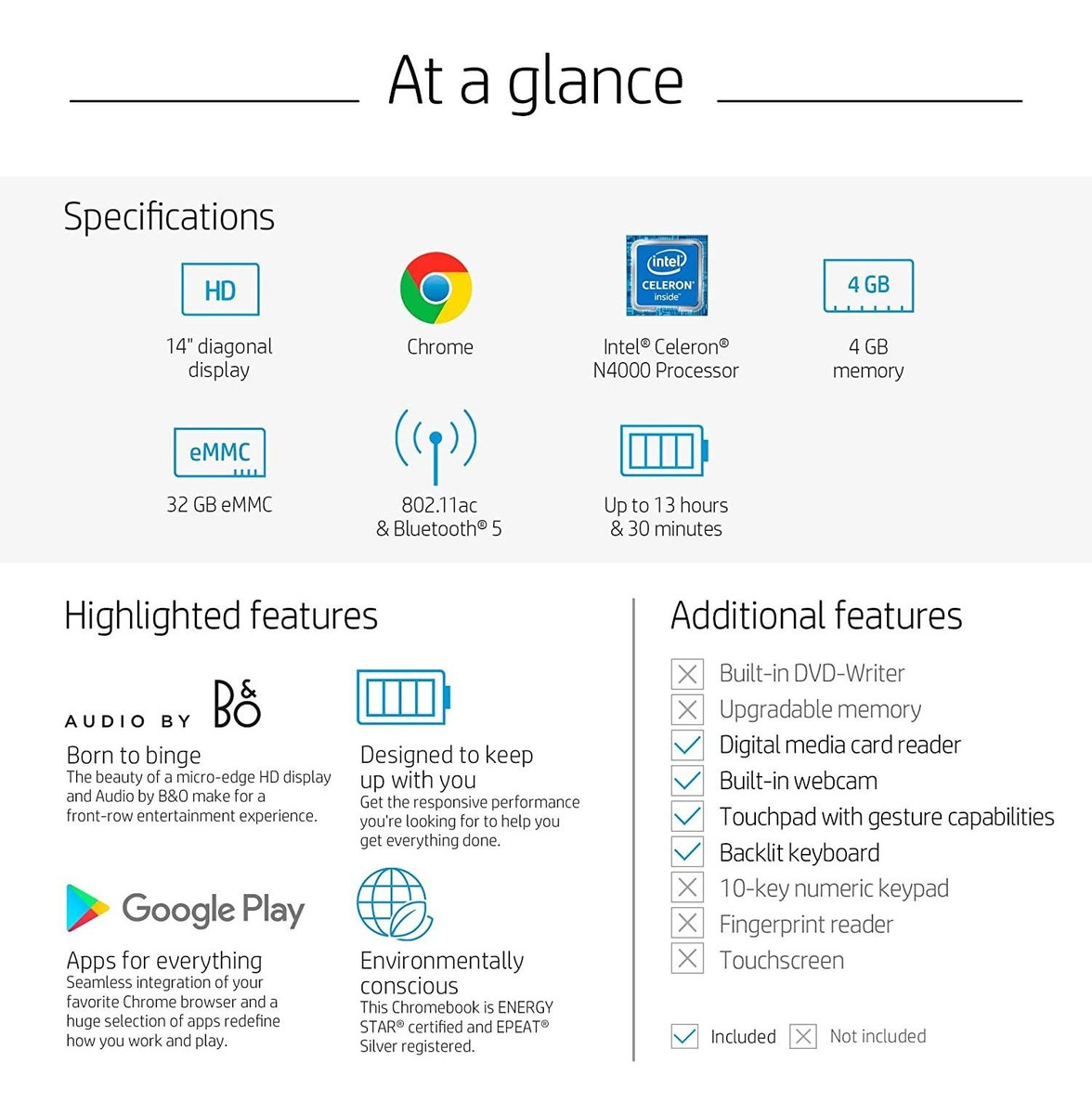 Google Play Store: los millones de aplicaciones Android que conoces y amas en tu teléfono y tableta ahora pueden funcionar en tu dispositivo cromado sin comprometer su velocidad, simplicidad o seguridad.; Diseño elegante y sensible: sigue funcionando cómodamente con el teclado retroiluminado y el panel táctil multitáctil que soporta cuatro gestos de dedos en un diseño elegante para moverse de habitación a habitación o en la carretera.; Binge reloj mientras trabajas: equipado con un procesador Intel(R), pantalla de 14 pulgadas, altavoces estéreo afinados por expertos de audio en BO y una batería de larga duración para hacer más mientras se divierte.; Respetuoso con el medio ambiente: bajo halógeno, retroiluminación de pantalla sin mercurio, cristal de pantalla sin arsénico en este Chromebook registrado en plata EPEAT(R).; Procesador Intel(R): Intel(R) Celeron(R) N4000, Dual-Core, frecuencia base de 1,1 GHz, frecuencia de ráfaga de hasta 2,6 GHz.; Pantalla: 14.0 pulgadas diagonal HD SVA antirreflejo micro-borde WLED pantalla retroiluminada (1366 x 768); 82% de relación de pantalla a cuerpo.; Memoria y almacenamiento: 4 GB LPDDR4-2400 SDRAM (no actualizable) y 32 GB eMMC.; Duración de la batería: hasta 13 horas y 30 minutos (uso mixto); 0 a 50% de carga en 45 minutos con HP Fast Charge; Delgado, ligero y portátil: 12.6 in (ancho) x 8.3 in (profundidad) x 0.7 in (alto); 3.1 lbs.; Sistema operativo: cromado. Capacidad:HD | Color:blanco (Ceramic White)