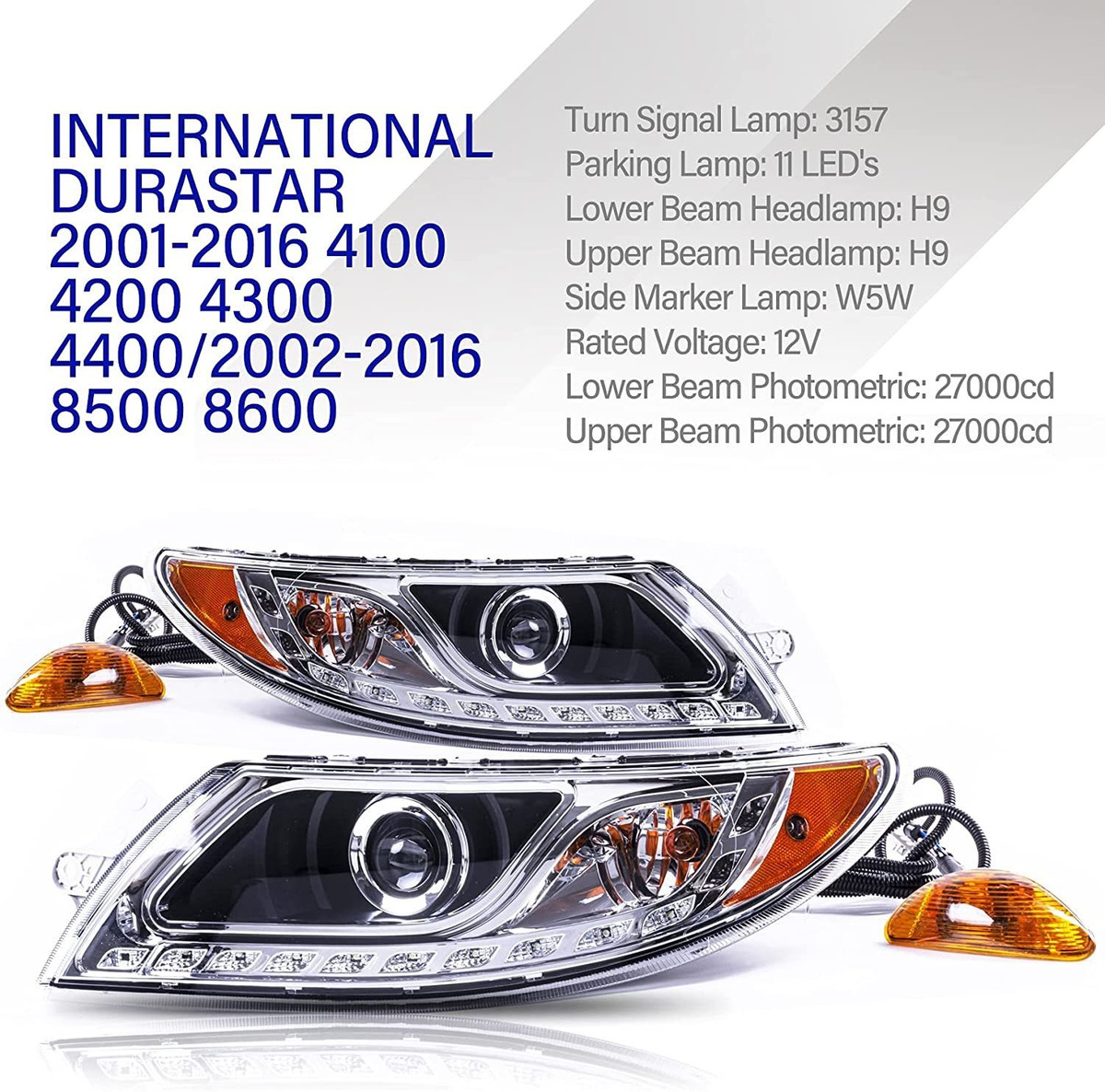 Compatible con todos los modelos internacionales Durastar (serie 4000) 2001-2016, Transtar 8500 8600 2002-2016.; Bombillas incluidas. Aprobado por DOT. Las bombillas de circulación son LED, las bombillas de haz alto/bajo son halógenas.; Piezas de alta calidad: impermeables, duraderas y fiables en condiciones meteorológicas adversas. LED brillante que mejora el rendimiento de la carretera.; Fácil de instalar: perno directo de repuesto para tus faros originales. No requiere cableado ni ninguna otra modificación.; 30 días de garantía de devolución de dinero y 90 días de garantía limitada. Todos nuestros productos estan en inglés SKU 4022206831
