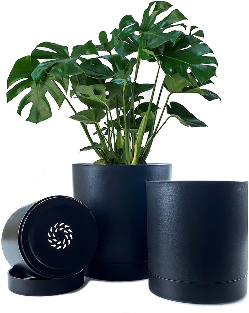 Macetas cilíndricas con orificio de drenaje y platillo.; Macetas de plástico de polipropileno, resistentes y duraderas.; Superficie mate, peso ligero, diseño minimalista.; 4.0 in, 5.0 in, 6.0 in en una caja. Juego de 3 unidades.; Platillo desmontable para evitar que la tierra caiga al exterior. Perfecto para plantas de interior. Color:Negro