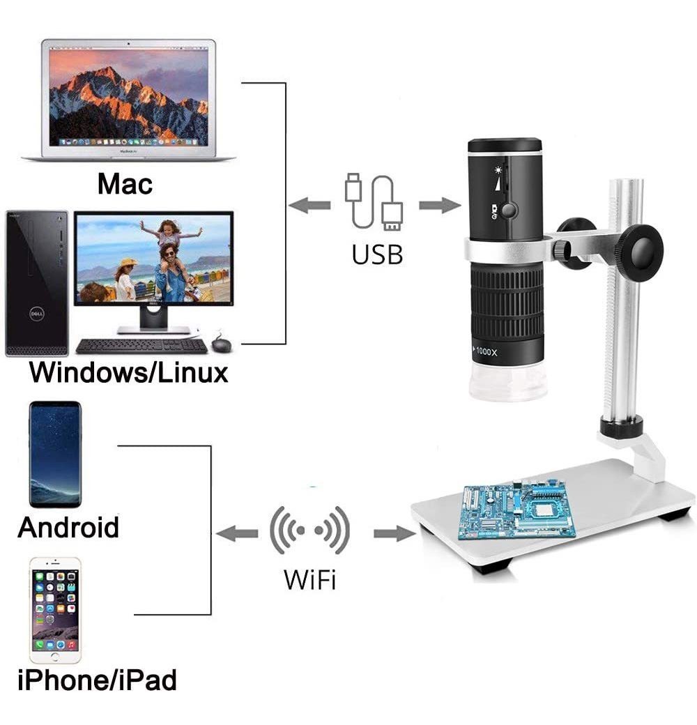 Microscopio WiFi nuevo modelo: El Nuevo microscopio WiFi de Jiusion es Mucho Más Útil y divertido Para Niños, Niños, Estudiantes, ingenieros y Otros Que necesitan aumentar Y EXPLORAR las micro Cosas Como placa de circuito, moneda, joyas, piel e insectos .; Amplia COMPATIBILIDAD: es compatible con iOS iPhone, iPad, Android Teléfonos Y tabletas, Mac, Windows XP 7 8 10 E INCLUSO Sistema Linux. Trabaje de forma Inalámbrica en el Teléfono móvil y por cable Conéctese para Trabajar en el PC .; Nuevo actualizado utilizació de chips Wi-Fi de la ONU de Nueva Generación, lo que hace Posible La transferencia Inalámbrica de vídeo de Alta Definición en los Teléfonos. Sin GAL en Ordenadores (píxeles originales 1280 720P) y Móviles (zoom digital 1920 1080P) CUANDO ESTÁN Completamente Cargados. Vienen Con Un Soporte de Aleación de aluminio actualizado la de Que es la base Más estable y mejor valorada en el Mercado de microscopios. Es El Primer microscopio WiFi de gran angular en El Mercado Que es Capaz de ver las Naciones Unidas de la zona Mas Grande .; Mas CARACTERISTICAS: 8 Luces Brillantes Integradas, 2 perillas de AJUSTE de microscopio digital de Que pueden change Enfoque y el brillo del LED. Los Botones de zoom permiten ampliar 1.2 / 1.4 / 1.6 / 1.8 / 2.0 x En Su Teléfono (sin para PC). La funda de transporte this Incluida en el paquete .; Ampliamente utilizado: Con Este microscopio USB, PUEDES Como utilizar el software para grabar El Mundo micro, Capturar Captura de pantalla de vídeo y grabar INCLUIDO en La Madera pecado Servicios de Datos. En el equipo de Ventanas, PUEDE Como utilizar la Función de Medición del Software para Medir el menor punto. El INCLUYE paquete: