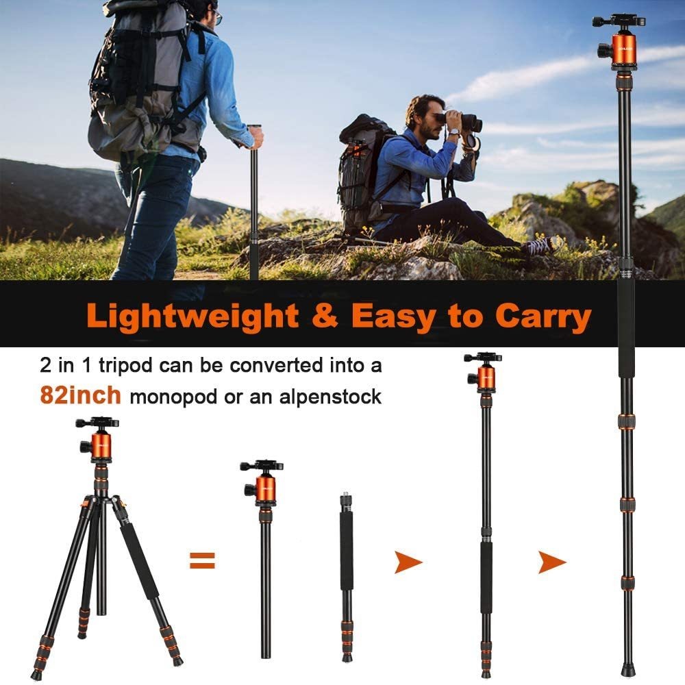 Rango de fit de altura Más Amplio: patas de aluminio de tres Secciones con cierres de giro Que extienden el trípode de 47 a 79,9 en EN Segundos Infinitas Posibilidades párr. La extensión de pierna independiente es Para Hacer Que Cada pata se fit a Tres Posiciones Separadas en terrenos irregulares; Construcción resistente mejorada: los Diámetros de cabeza de bola Mas Grandes de 1.496 en el hijo de Aleación de aluminio, Lo Que ánade Seguridad y Estabilidad en general de la Cabeza. Tubo de patas de aluminio Más grueso y fuerte con bloqueo de giro Que Mejora AÚN MAS LA Estabilidad En Una Amplia Variedad de superficies; Compañero de Viaje: Longitud plegada compacta de 18,5 en solitario en y Cómoda con bolsa de trípode Para Llevar párrafo caminatas Cortas e INCLUSO Viajes de Larga Distancia. Este trípode de 3,37 libras Soporta Cámaras de Apuntar y Disparar, el pecado espejo y DSLR CON UN pesos up to 19 libras; Monopode Integrado: Una pata se Convierte En un monopié párrafo Mayor versatilidad y comodidad. Una Característica Gran párrafo Los Viajeros Que pueden ENCONTRAR Y Lugares Lugares donde son los trípodes no estan Permitidos, Pero los monopiés hijo; Cabeza de bola profesional: el cabezal de bola de doble Acción Tiene Un bloqueo Pan independiente que te permite Girar la cabeza de 360 , y Un bloqueo de bola para colocar Una Cámara En un ángulo de 90 con la muesca de corte Situada en el lateral de la Cabeza Color: Naranja / Fiesta de bloques