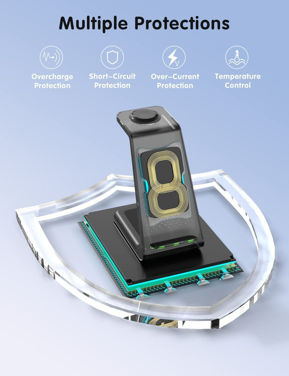 Estación de carga para múltiples dispositivos Apple: este cargador inalámbrico JoyGeek 3 en 1 puede cargar 3 dispositivos a la vez: iPhone, iWatch y AirPods conectando un cable. Los modelos de teléfono compatibles son iPhone 13/13 Pro/13 Pro Max, 12/12 Pro/12 Pro Max, 11/11 Pro/11 Pro Max, SE/X/XR/XS/XS Max/8/8 Plus; compatible con Apple Watch Series 6/SE/5/4/3/2 (no funciona con relojes de otras marca) y AirPods Pro (necesita carga con la funda inalámbrica).; Carga rápida de 7,5 W para iPhone: en comparación con la potencia de carga del adaptador de carga oficial de 5 W, la velocidad de carga de nuestra estación de carga para iPhone aumenta un 20 %. La estación de carga superior para Apple Watch es una potencia de carga de 3 W. La estación de carga trasera de Airpods tiene una potencia de carga de 5 W y esta estación de carga inalámbrica trasera también puede cargar un teléfono habilitado para Qi. Además, nuestro paquete incluye un adaptador QC3.0 de 18 W y un cable USB-C de 3.3 pies. Paquete completo, uso sin preocupaciones.; Certificado Qi y múltiples protecciones: nuestro soporte de carga inalámbrico JoyGeek certificado por Qi, hecho de material ABS que es resistente al fuego trae a tus dispositivos múltiples protecciones como detección de objetos, control de temperatura, sobretensión, protección contra cortocircuitos y mucho más. Además, hemos diseñado cuidadosamente algunos agujeros de disipación de calor en la parte posterior, lo que puede reducir la acumulación de calor y proteger tus dispositivos cuando se carga.; Compatible con la funda del teléfono: nuestro cargador inalámbrico para iPhone puede cargar su teléfono normalmente incluso con una funda de 0.197 in de grosor, como una funda de silicona suave, una funda transparente lisa y una funda magnética oficial. Pero la funda de metal, la almohadilla magnética, la tarjeta de crédito, los agarres y los soportes y la funda con un grosor superior a 0.2 pulgadas interferirán con la carga. Por favor, retira estas fundas cuando se carga.; Gran servicio al cliente JoyGeek: además del servicio oficial de devolución e intercambio de 30 días, JoyGeek también proporciona servicio de reemplazo o reembolso del producto de 24 meses y servicio de respuesta a preguntas de por vida. Responderemos dentro de 12 horas. En JoyGeek, tu satisfacción es nuestro mayor objetivo. Estamos listos. Todos nuestros productos estan en inglés SKU 91221078582