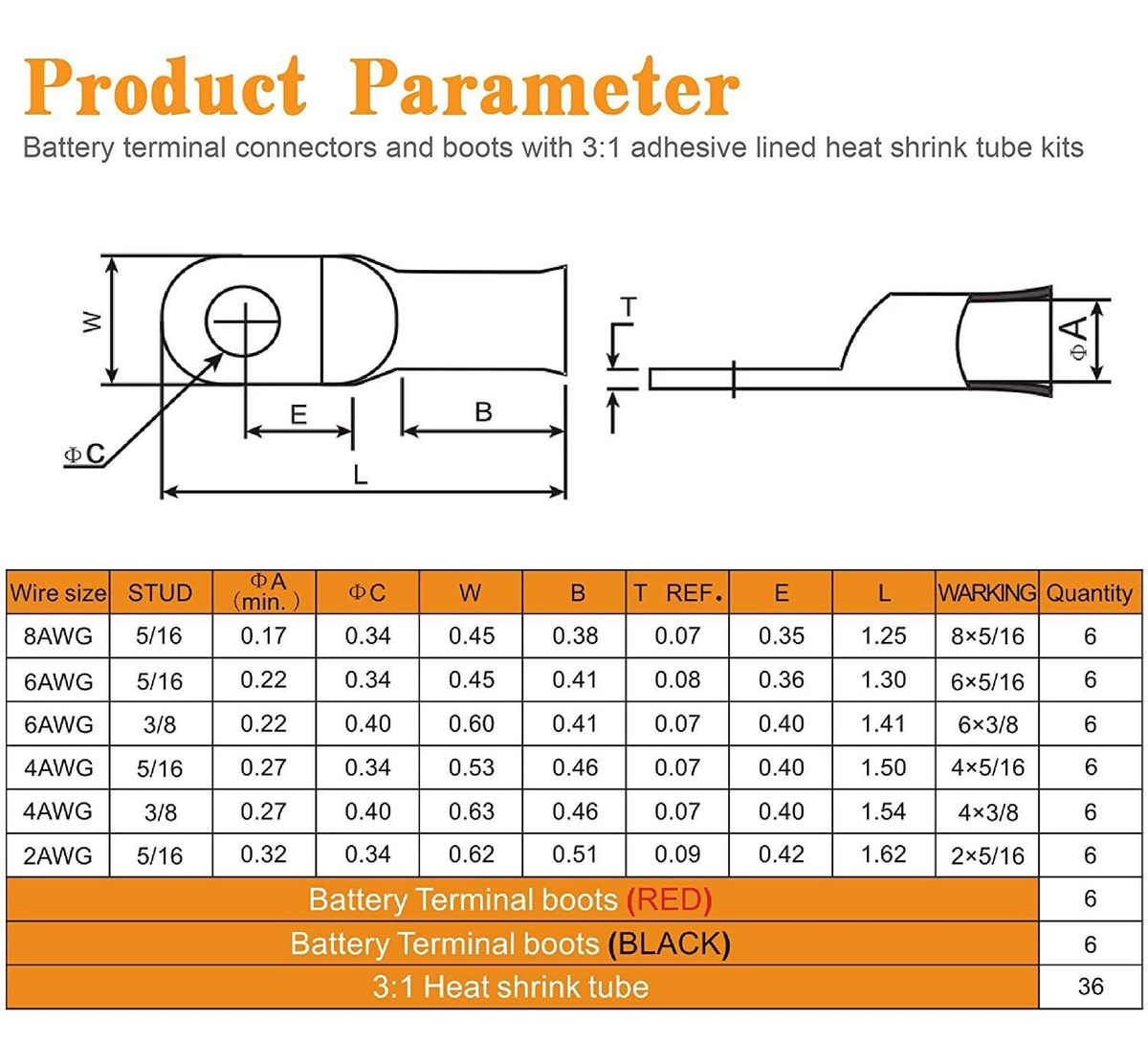 El kit INCLUYE: un total de de 84 piezas En Una caja, el paquete INCLUYE AWG 8 x 5/16 (6 piezas), 6 x 5/16 (6 piezas), AWG 6 x 3/8 (6 piezas), AWG 4 x 5/16 (6 piezas), AWG 4 x 3/8 (6 piezas), AWG 2 x 5/16 (6 piezas), botas de terminales de Bateria negro (6 piezas), botas de terminales de Bateria rojo (6 Piezas), 3: 1 adhesivo de grado marino con revestimiento termorretráctil (36 piezas). S).; Calidad premium: Nuestras clavijas de alambre de cobre Tienen Certificación UL, ofrecen la ONU Rendimiento confiable. El conector de alambre de cobre this Hecho de cobre electrolítico recocido Totalmente Que proporciona Una excelente conductividad. 100% cobre recocido resiste la corrosión de sal y Humedad .; El tubo termorretráctil con revestimiento adhesivo de grado marino Tiene Certificación UL y CSA, RoHS estafadores cumple, libre de formaldehído (HCHO), Metales Pesados y Otras sustancias nocivas. Es una relacion de termorretráctil de 3: 1 y se encoge Hasta un tercio de original, en solitario utilizació ONU secador de pelo o pistola de calor para calentarlo .; La Cubierta párrafo flexibles Terminales de Bateria this diseñada para adaptarse a Tuercas y pernos de 5/16 Pulgadas 3/8 . Se utilizació para proteger contra Cortocircuitos accidentales y La corrosión MIENTRAS Mejora la Apariencia. Disponible en rojo y negro ,; Dureza de los terminales: HV: 120 – 70, superficie: prueba de pulverización de sal 48 H Protección del Medio Ambiente niebla lata, material: T2 cobre de baja resistividad. Color: Terminal, botas y 3: tubo de contracción 1 de calor