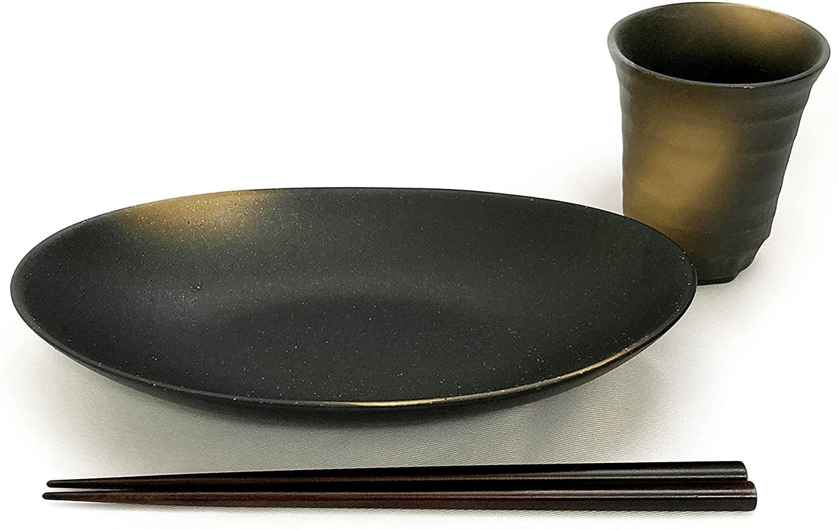 Cerámica tradicional japonesa MINO-YAKI. El artículo de vajilla japonesa hace que tu comedor tenga un estado de ánimo especial. Con caja de regalo. También es bueno para regalar a tu familia y amigos.; 2 platos elipsados grandes, 2 tazas múltiples y 2 palillos con una caja de regalo. Tamaño: plato de 9.3 x 4.9 x 1.6 in, taza de 3.1 x 3.1 x 3.7 in, palillos de 8.9 in; Hermosos platos. Los llamativos colores de contraste nos dan la impresión de la tierra natural. El plato afilado elipsado es bueno para arroz japonés de curry y cualquier cocina.; Apta para microondas y lavavajillas. Fabricado en Japón. Productos de alta calidad.; Debido a la particularidad de la cerámica, el tamaño y el color pueden ser un poco diferentes de la imagen del producto. Nota: el color puede ser más claro o más oscuro debido a las diferentes pantallas de PC. Color negro y marrón, cerámica japonesa, MINO-YAKI. Juego de platos de cena. 2 platos grandes elipsados, 2 tazas y 2 palillos Todos nuestros productos estan en inglés SKU 91221039588