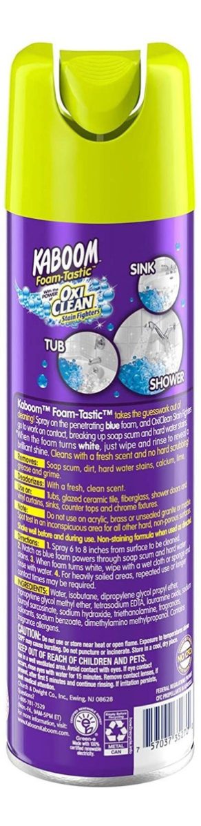 Kaboom Espuma-Tastic con Oxiclean aroma fresco limpiador de baños toma el trabajo de adivinar de limpieza. Nuestros cambio de color, aerosoles fórmula en azul y se vuelve blanco cuando está listo para limpiar. Potente Oxiclean burbujas para combatir las manchas hacen el trabajo duro y la lucha a través de los restos de jabón, agua dura, calcio y manchas de cal. Todo lo que queda para usted que hacer es limpiar fácilmente para revelar espumoso superficies limpias. Es 100% resistente en polvo y la suciedad sin fregar duro para ti! Alejándose de un cuarto de baño que sabe que está limpia – con un aroma fresco luz – es tan satisfactorio! Incluye cuatro 19 oz Botella de espuma Kaboom-Tastic con Oxiclean con fragancia de limón limpiador de baños. En Kaboom, hemos sido siempre un apasionado de proporcionar la mejor experiencia posible baño de limpieza, nuestros productos están especialmente formulados para proporcionar una limpieza se puede ver! Ingredientes: agua, isobutano, dipropilenglicol propil éter, tripropilenglicol metil éter, EDTA tetrasódico, óxido de lauramina, sodio lauroil sarcosinato, hidróxido de sodio, trietanolamina, fragancias, colorantes, benzoato de sodio, dimetilamino metilpropanol Todos nuestros productos estan en inglés SKU 8112021733