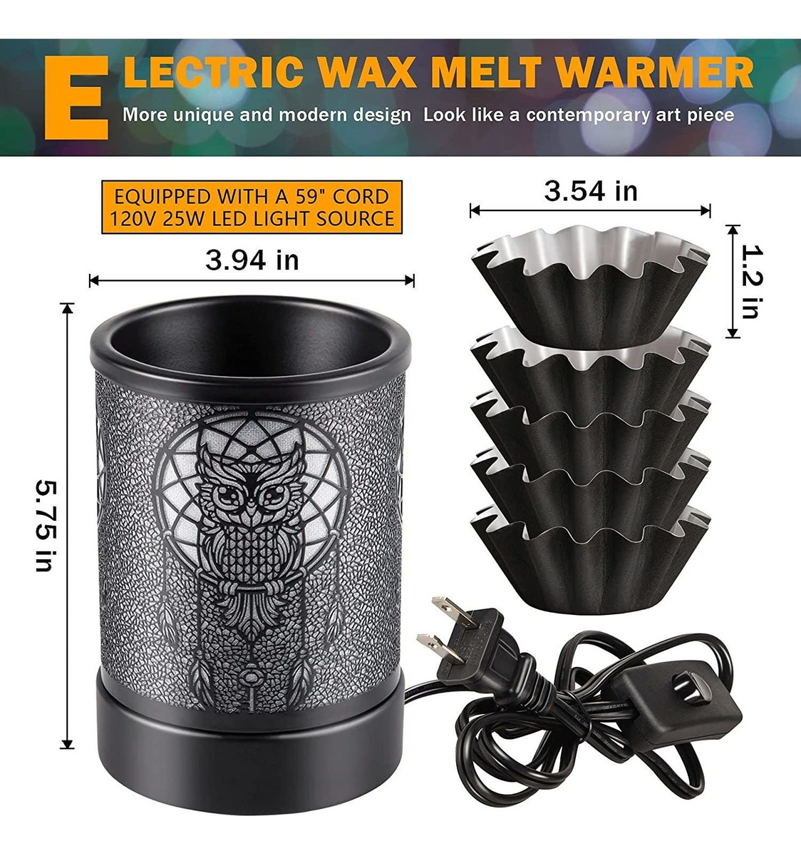 METAL; Exquisito diseño de búho: la pantalla de metal del calentador de cera se derrite con un meticuloso patrón hueco. Disfrutarás de una hermosa iluminación ambiental mientras llenas tu casa con tu fragancia favorita. La combinación perfecta de aromaterapia tradicional y lámparas.; Luces LED coloridas: 7 luces LED que cambian de color crean un ambiente tranquilo cuando trabajas o duermes. A través del interruptor, puedes cambiar entre tres modos: cambio lento multicolor, cambio rápido multicolor y múltiples luces monocromáticas para obtener el efecto deseado y disfrutar de una mejor experiencia sensorial en cualquier momento y en cualquier lugar.; Fuente de luz LED y calefacción electrónica: (1) La fuente de luz del calentador de cera perfumado LED de 7 colores es LED de alta calidad, que tiene una larga vida útil y no necesita reemplazar la fuente de luz. (2) La parte de calefacción del quemador de cera eléctrico adopta calefacción electrónica tipo chip de cerámica, que tiene un control de temperatura estable. La estructura de los dos derretidores de cera aromática puede hacer que la vida útil del calentador alcance de 3 a 5 años.; Revestimiento de cera reutilizable y a prueba de fugas: no hay necesidad de preocuparse por fugas, porque utilizamos material de revestimiento protector a prueba de fugas dentro de los contenedores de cera derretida. El forro de cera está hecho de papel de calidad alimentaria calentable, que es muy delgado y por lo general no afecta a la propagación del aroma.; Garantía de calidad: el calentador de cera Kanlarens para cera perfumada puede calentar el aceite esencial o derretir cera perfumada para liberar la fragancia que a las personas les gusta. También se puede utilizar como una luz de ambiente para crear un ambiente único. Período de garantía de calidad: 120 días de reembolso y 12 meses sin preocupaciones. Todos nuestros productos estan en inglés SKU 91221019643