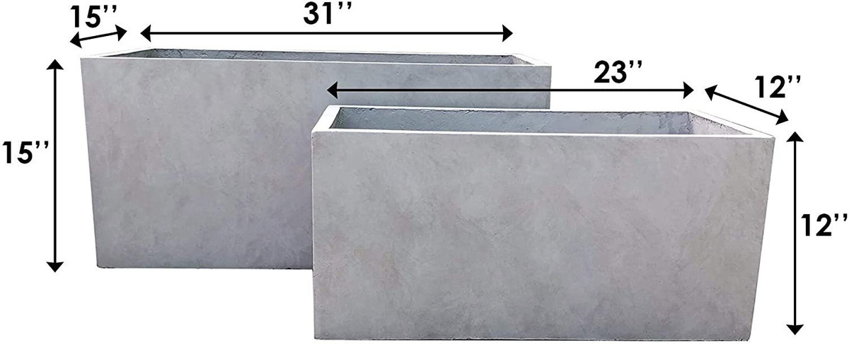 Estas elegantes macetas rectangulares tienen un acabado de concreto auténtico con poros visibles las hacen hermosas piezas contemporáneas. El aspecto y la sensación es cierto concreto, pero pesa sustancialmente menos de lo que parece. También tiene un acabado muy suave en lugar de alfareros de hormigón áspero que podría estar acostumbrado. El tamaño es muy generoso y puede contener una buena cantidad de plantas sin parecer abarrotado. Tiene una sensación más moderna al ser líneas rectas y hormigón. Se vería genial en el balcón del apartamento o patio trasero grande. Crea un espacio moderno con estas macetas largas y bajas. Las líneas rectas y el acabado gris sólido son una tendencia caliente en diseños de paisajes modernos. Ideal para suculentas y plantas delicadas que necesitan espacio para crecer. Hecho de hormigón ligero a través de un proceso de fabricación. Este material compuesto no tiene rubro, plástico y acero. Este material tiene todas las ventajas del concreto tales como resistencia, durabilidad, tiempo y resistencia al daño. Los materiales implican cemento y fibra de vidrio resistente a la intemperie. Este material tiene una fuerte capacidad resistente a los rayos UV y se mantiene bien en el viento, la lluvia, el calor y la estación fría. Al añadir material de fibra de arcilla, la maceta es mucho más fácil de moverse debido a su peso más ligero. Todos nuestros productos estan en inglés SKU 15092135732