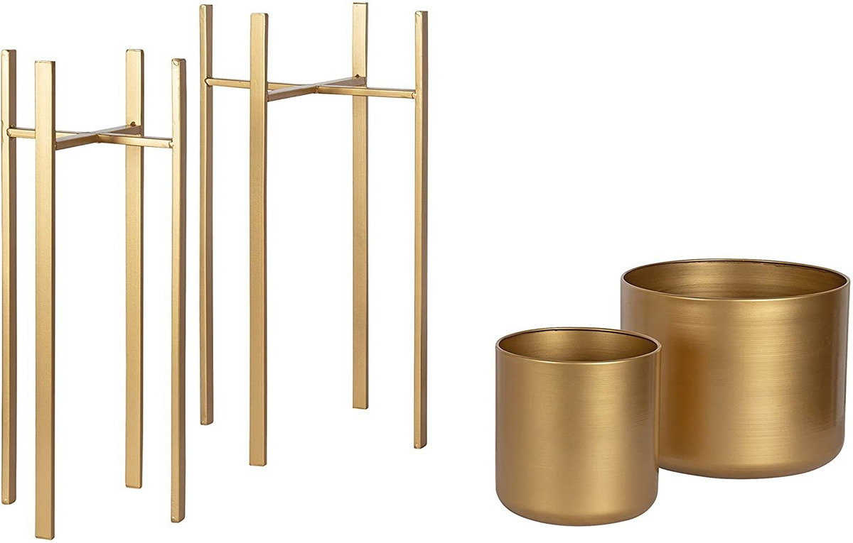 La magnífica forma cilíndrica del juego de macetas Kate y Laurel Gabi le dará a tus plantas de interior un verdadero levantamiento.; La altura de este juego de soporte permite que el drama de las plantas en cascada se derrame por los lados. La maceta más grande se encuentra dentro de una base de metal a 27 pulgadas de alto, y el recipiente más pequeño es de 25.25 pulgadas de alto desde el suelo.; Una hermosa forma redonda crea un montón de espacio para una variedad de plantas domésticas. El contenedor más grande tiene una apertura de 10.75 pulgadas de diámetro y es de 9 pulgadas de alto, dejando un montón de espacio para una planta en maceta de buen tamaño.; La forma circular profunda de los recipientes permite que la mayoría de las macetas se adapten fácilmente al interior. El recipiente más pequeño tiene una apertura de 7.5 in de diámetro y mide 7.5 in de alto.; La construcción de metal ligero y robusta hacen que sean fáciles de mover. Utilízalos en un baño, un dormitorio o un porche cubierto o patio para una hermosa exhibición. Tamaño:2 piezas | Color:Dorado