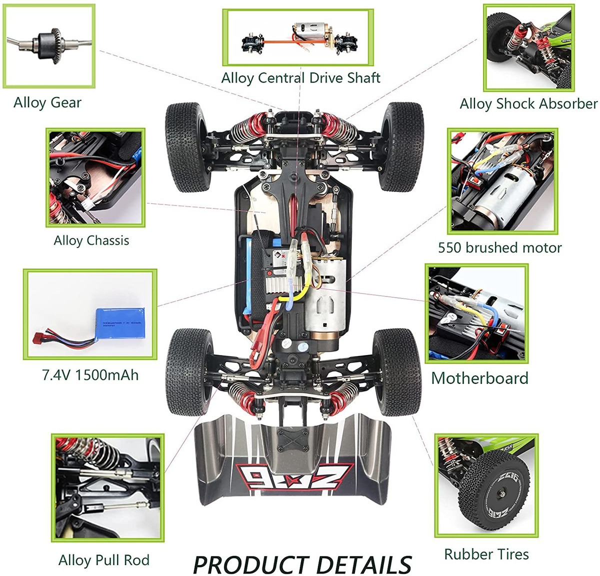 Material de alta calidad y fuerte estabilidad: marco y base de aleación de aluminio de alta resistencia y engranajes de aleación de zinc con una fuerte estabilidad. Escala 1:14 WLtoys 144001 RC seguridad del coche y protección del medio ambiente, no tóxico y sin olor, duradero, resistente al desgaste y anticaída, y la superficie es lisa sin púas, por lo que puedes estar seguro de usar; A prueba de golpes todoterrenoEl coche con control remoto de cada rueda está instalado con amortiguadores de resorte helicoidales de metal, que pueden evitar daños causados por la vibración de forma eficaz y proteger los componentes electrónicos dentro del cuerpo del coche. Cuerpo principal de ABS resistente a los impactos que garantiza que tiene una fuerte resistencia a la colisión que no se romperá si cae desde alta altitud para arena, prado, montaña y roca, incluso tierra de nieve, ninguno de ellos puede detener el deseo de conducción de tus coches a control remoto.; Sistema de radio de 2,4 GHz: sistema de radio de 2,4 GHz con capacidad antiinterferencias que permite correr al mismo tiempo en la misma pista. Distancia de control de 328.1 ft, carreras libremente. También tiene ajuste de giro y ajuste del acelerador, controla la velocidad de baja a alta que se puede ajustar a tu estilo.; Velocidad máxima de 37.3 mi/h y capacidad de batería potente: los coches con control remoto utilizan 2 baterías de litio de alta velocidad, el coche a control remoto funcionará hasta 35 minutos (1500 mAh 3000 mAh), potencia súper fuerte personalizada de 2000 rpm, 550 motores, controlador de velocidad electrónica de 60 A, velocidad de hasta 37.3 mi/h, 4 WD puede proporcionar un fuerte par de potencia potente. C Coche fácil de completar movimientos difíciles, y proporciona un rendimiento de funcionamiento estable y de alta velocidad, lo que te permite disfrutar de una maravillosa experiencia de carreras.; Coche de carreras de nivel básicoEste coche WLtoys 144001 RC es la mejor opción para jugadores de nivel básico, proporcionando una excelente experiencia de carreras. Diseño de estructura de simulación completa, para lograr una conducción de alta velocidad y aceleración instantánea, desaceleración y frenado. Adecuado para competiciones de lugares pequeños y medianos. Todos los accesorios del coche se pueden modificar y se pueden actualizar según tus propias necesidades. Al mismo tiempo, también es un regalo perfecto para niños y adultos. Todos nuestros productos estan en inglés SKU 13102103581