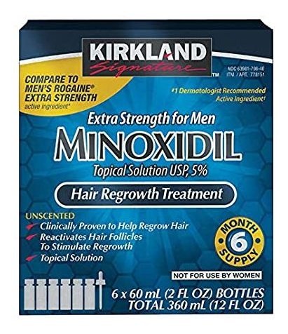 El tratamiento nuevo crecimiento del pelo para los hombres; Vuelve a crecer más pelo; 5% solución de minoxidil tópico; Resultados pueden ocurrir a los 2 meses; Folleto de información sobre cómo utilizar y obtener mejores resultados Kirkland Minoxidil-5% Extra Strength nuevo crecimiento del pelo para los hombres, 6 mes de suministro Todos nuestros productos estan en inglés SKU 12062106538