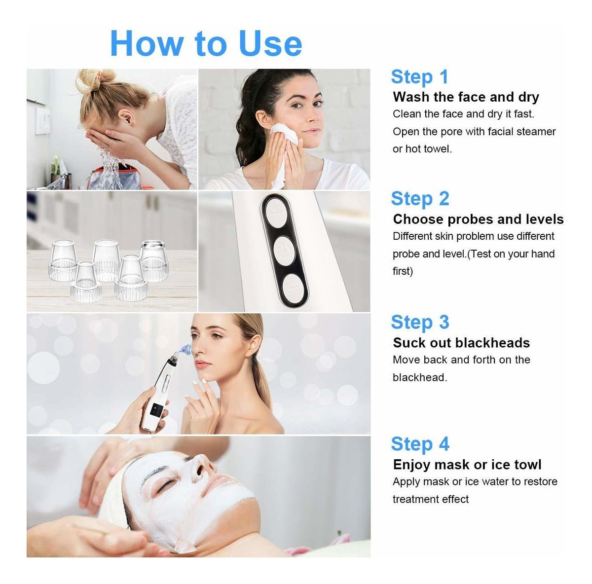 8. de Cuando utilice el removedor de puntos negros, comience Con Un Nivel Más Bajo de succión, especialmente para pieles sensibles.