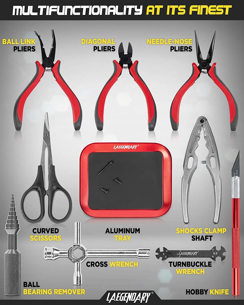 Bolsa de Herramientas completa para RC – Las Herramientas de manía de LAEGENDARY RC INCLUYEN: Juego de destornilladores hexagonales (0,059 en 0,079 en 0,098 en 0,118 pulgadas), llaves de caja (0,157 en 0,217 en 0,276 en 0,315 pulgadas), destornillador Phillips (0,118 pulgadas 0,157 in), Controladores de ranura (0,118 en 0,157 in), aguja de nariz / diagonal / alicates de bola de enlace, escariador de Cuerpo, cuchillo de manía, cruz y hebilla giratoria. inglesa llave, vástago de abrazadera de choque múltiple, Tijeras, removedor de rodamiento de bolas, Soporte de coche RC, manómetro de Campista . Todos nuestros productos estan en inglés SKU 29102021574
