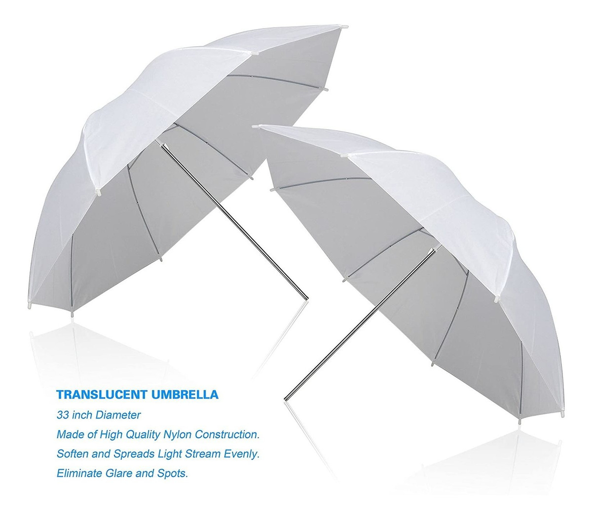 Kit de Iluminación Profesional párrafo Fotografia de retrato, Grabación de vídeo, etc .; (2) x 45 W 5500 K ahorro de Energía de CFL – Bombilla de luz continua; 2 paraguas reflector translúcido de 32,7 en el de Diámetro, de color blanco; (2) Soportes de luz de fotografía de 82,7 en, ajustable altura (Mínimo 29,9 en – Máximo 82,7 in) .; (2) x Soporte de lámpara de cabeza Única para Iluminación fotográfica, la base E26 / E27. Todos nuestros productos estan en inglés SKU 4022164110