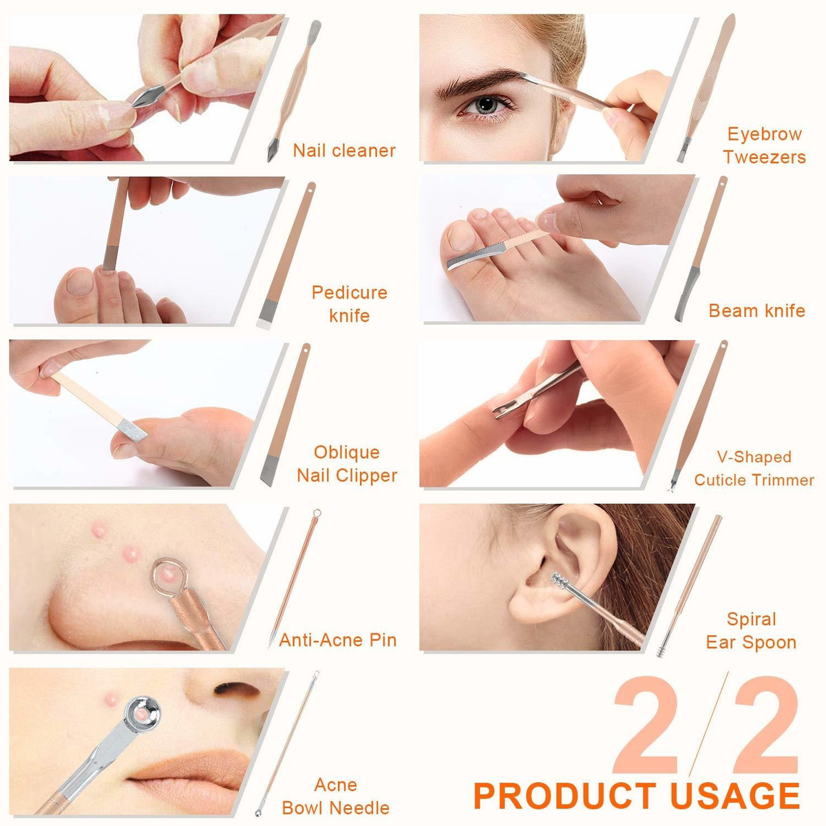 Satisface Todas tus Necesidades: Este kit de pedicura Todo en uno Contiene 18 piezas de Herramientas Como cortaúñas, Herramientas para uñas de los pies, tijeras y pinzas para el Tratamiento facial, Cuidado de Manos y pasteles; Perfecto para manicura, pedicura, Eliminación de puntos negros y espinillas, y moldear cejas; Calidad Premium: Las Herramientas de aseo ESTÁN Hechas de acero inoxidable de grado quirúrgico, Que es resistente, Duradero y resistente a la corrosión para Minimizar el Riesgo de Infecciones; el Borde de Cada Herramienta ha Sido pulido para Tener un agarre Cómodo, perfecto para Todo tipo de uñas y recortes; Aspecto elegante: Viene con Una funda de piel sintética Que se abre facilmente ONU de la estafa empuje del botón Aportes; La funda es suave al tacto, Ligeramente acolchada en el exterior y se cierra firmemente para sujetar de forma segura las hermosas Herramientas de color de rosa dorado en el interior; Compacto y portátil: el Tamaño de la funda es compacto, lo que hace A que sea practico y Fácil de Poner en tu bolsa de moda Durante Tu Viaje; Todo está Organizado en el pequeño estuche, PUEDES ONU darte Capricho en any Lugar Que desees; Regalo de Cuidado personal: Este juego de Cuidado multifuncional con elegante funda de poliuretano es un regalo perfecto Familiares Tus Pará, Familiares y Amigos en Navidad, Día de San Valentín, Día de la Madre y Día del Padre No un: